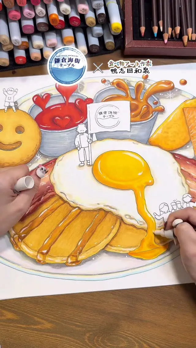 【54秒】メイキング動画🎥🎨 𖡼.𖤣𖥧𖡼.𖤣𖥧𖡼.𖤣𖥧𖡼.𖤣𖥧𖡼.𖤣𖥧𖡼.𖤣𖥧𖡼.𖤣𖥧𖡼.𖤣𖥧𖡼 🍺鎌倉海街テーブル ( @kamakura_umimachi_table ) × 🎨食べ物アート作家 鴨志田和泉 ( @izumi_chuchu ) そごう横浜10階レストランフロアにある “鎌倉海街テーブル”さんの壁画アートを、 食べ物アート作家・鴨志田和泉が 制作させていただきました🙌 ※この投稿は、izumiの投稿を鎌倉海街テーブルさんのInstagramでも共同投稿しています。 𖡼.𖤣𖥧𖡼.𖤣𖥧𖡼.𖤣𖥧𖡼.𖤣𖥧𖡼.𖤣𖥧𖡼.𖤣𖥧𖡼.𖤣𖥧𖡼.𖤣𖥧𖡼 鎌倉海街テーブルさんは、そごう横浜 10階にあるファミリーダイニング🍽️ 昨年は「香る金木犀ビール」でコラボした、 鎌倉ビールさん( @kamakura_beer ) の直営店舗です🍻 今回は、そんな鎌倉海街テーブルさんの 世界観に合わせて、正面入り口の壁画アートを 担当させていただきました! 本日からご覧いただけますので、 お近くの方はぜひ見に来てくださいね🤗 遠方の方は、来週6/19に公開予定の リール動画でもご紹介します🙌 (ストーリーでは少しだけ先行公開中です☺️) 今日は、壁画アートの元になった 原画アートのメイキング動画をお届けします🎥 ✎__________________ 今回のコンセプトは ✨食べることはエンターテインメント! 食のミュージアム✨ 鎌倉海街テーブルさんは、心がわくわく するメニューがいっぱい! 店内にはキッズスペースもあり、 大人も子どもも一緒に楽しめる空間です🤱 そんなお店で「ごはんを食べること」 そのものがエンターテインメントだと感じ、 その世界観を壁画アートに込めました🎨 アートの中では、食べ物たちがまるで“島”のようになっていて、 その上で小さな人々が遊んでいます♪ キッズパンケーキの上でおしゃべりしたり、 プリンアラモードのブランコに揺られたり、 クリームソーダの中を泳いだり…🍹 眺めるだけで、物語の中に入り込めるような、 “見る食体験”としてのアートになっています。 完成を見に伺ったら、 早速親子が壁画の前で写真を撮って くださっていてとても嬉しかったです✨ フォトスポットとしても、 ぜひ楽しんでいただけたら嬉しいです📸 ✎__________________ 描いたアートの元になったメニューは、 実際に店内でご注文いただけますので、 ぜひ食べてみてくださいね😋🙌 #鎌倉海街テーブル #鎌倉ビール #そごう横浜 #横浜そごう #壁画アート #食べ物アート #食べ物イラスト