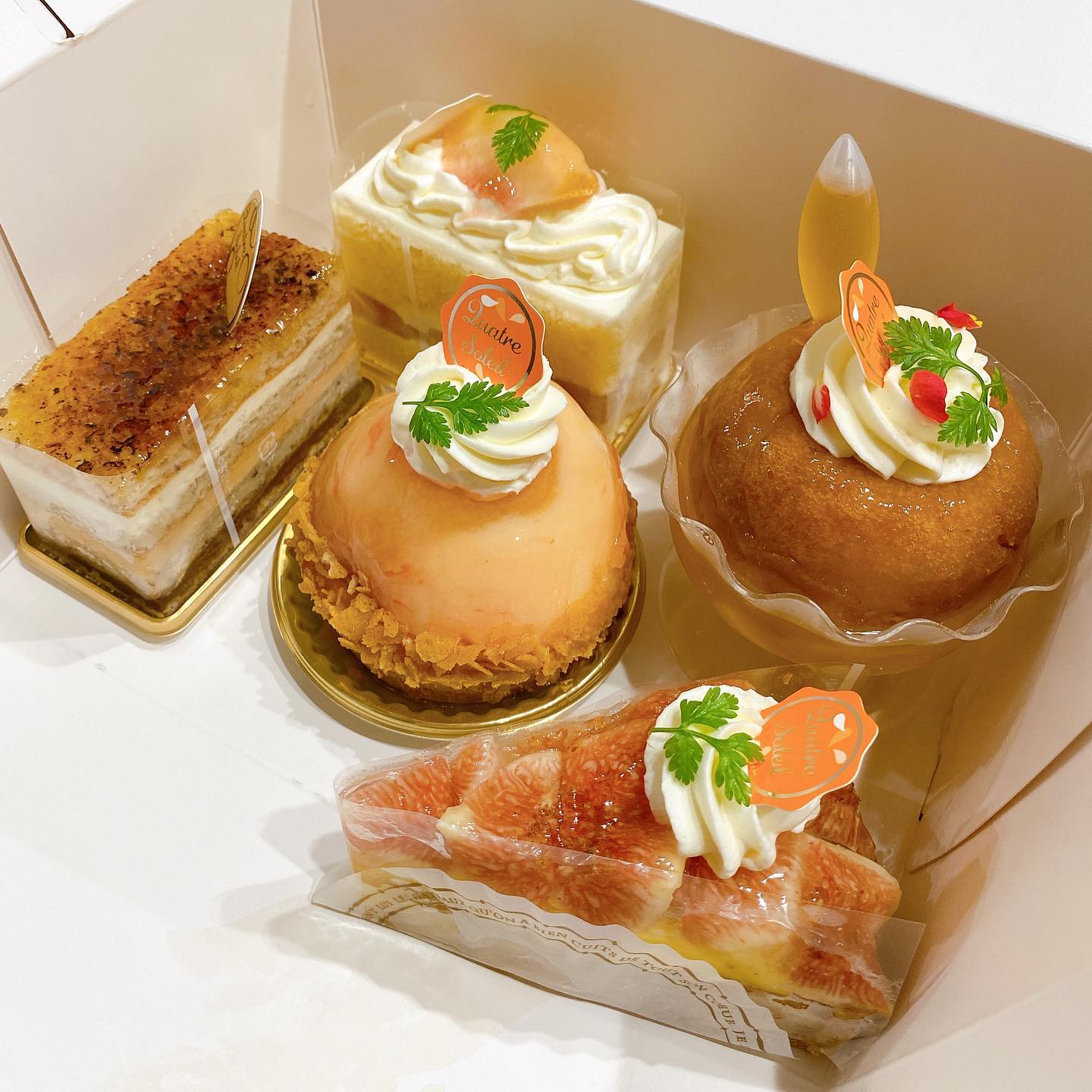 キャトルソレイユは多彩な洋菓子が揃うケーキ店です。定番のタルトフレーズやガトーショコラをはじめ、マルジョレーヌ、桃ショート、いちじくのタルト、サバランなど季節ごとに変わる個性的なケーキが魅力。クリスマスのケーキも豊富で、ホールよりいろいろ組み合わせて楽しめます。