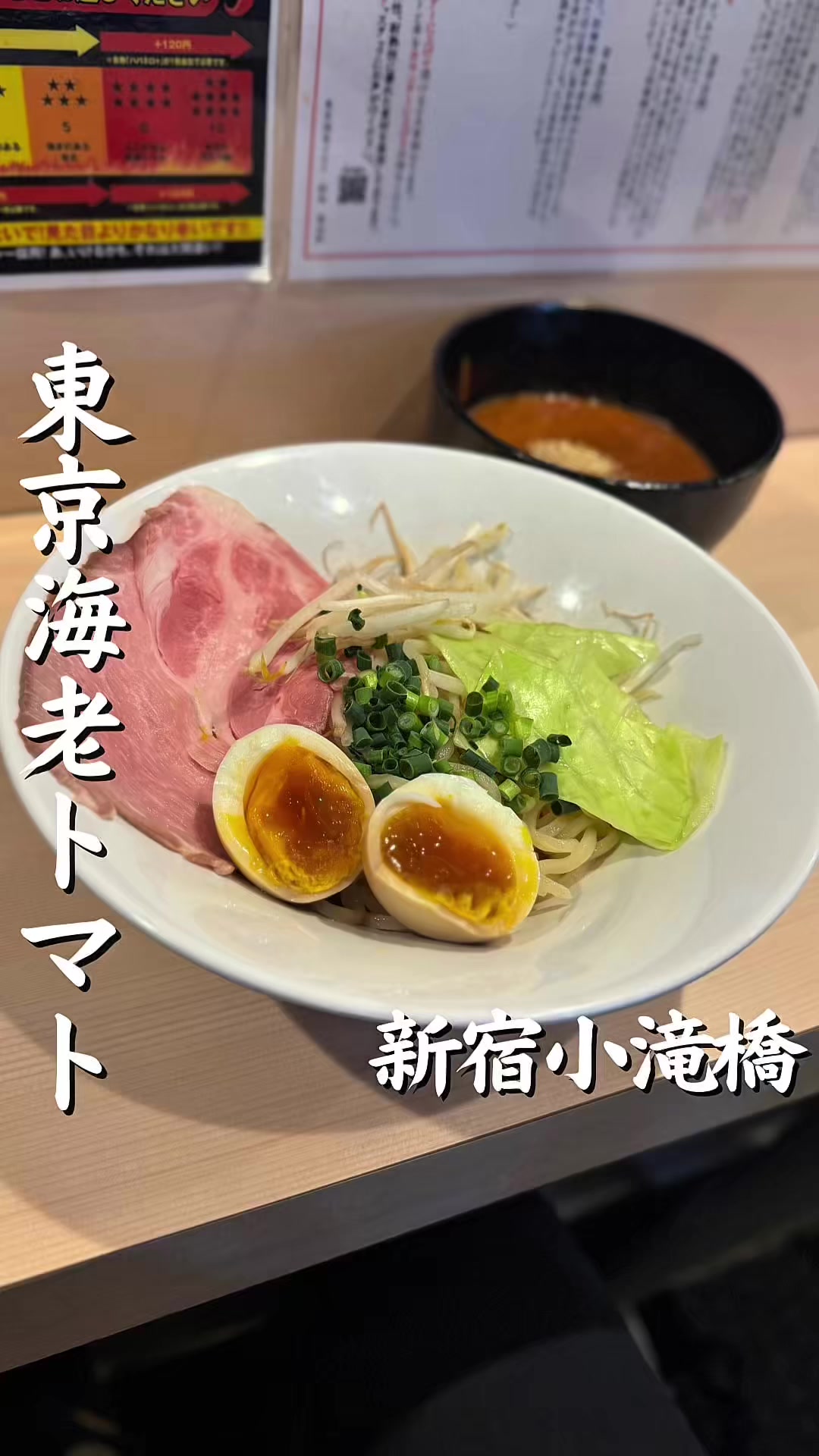 新宿西口にある『東京海老トマト』は、海老とトマトの濃厚出汁が魅力のラーメン店です。トマトベースとオマール海老ベースの2種スープに加え、つけ麺はドロッとした濃厚ソースが特徴。サービス盛りのキャベツとバゲットも楽しめ、カウンター11席程度のこぢんまりとした店内です。