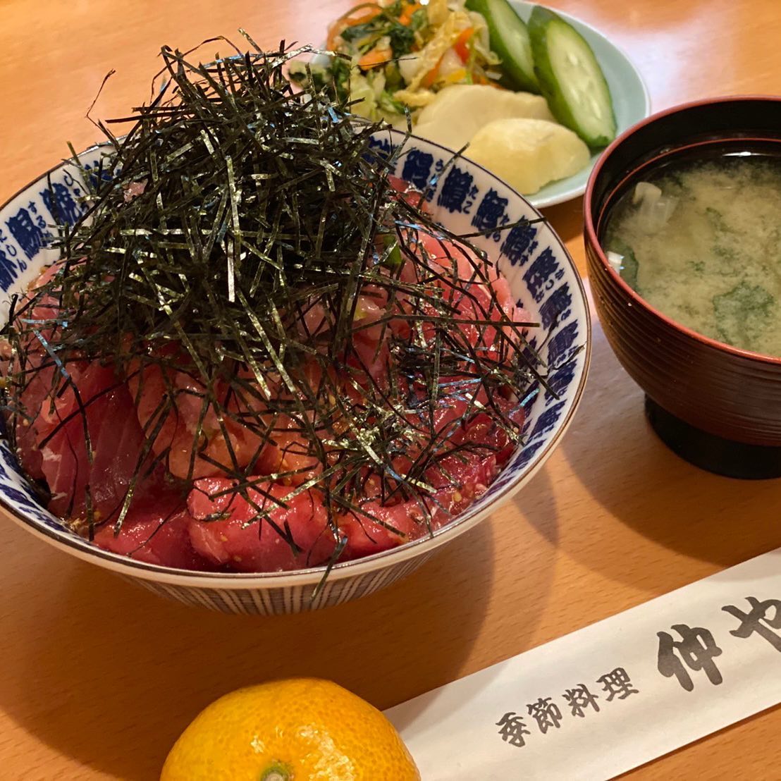 生マグロ丼中盛(漬物、味噌汁、みかん付)1500円。