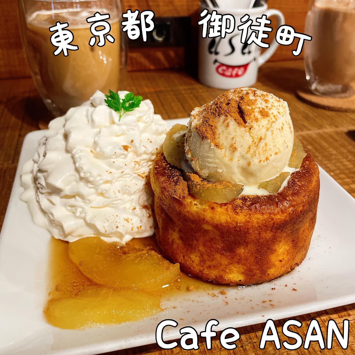 Cafe ASANは御徒町・上野エリアにあるハンモック席が特徴のカフェです。厚焼きスフレパンケーキが名物で、トリプルチョコやアップルシナモンなど多彩な味を楽しめ、生クリーム盛りのビジュアルも華やかです。