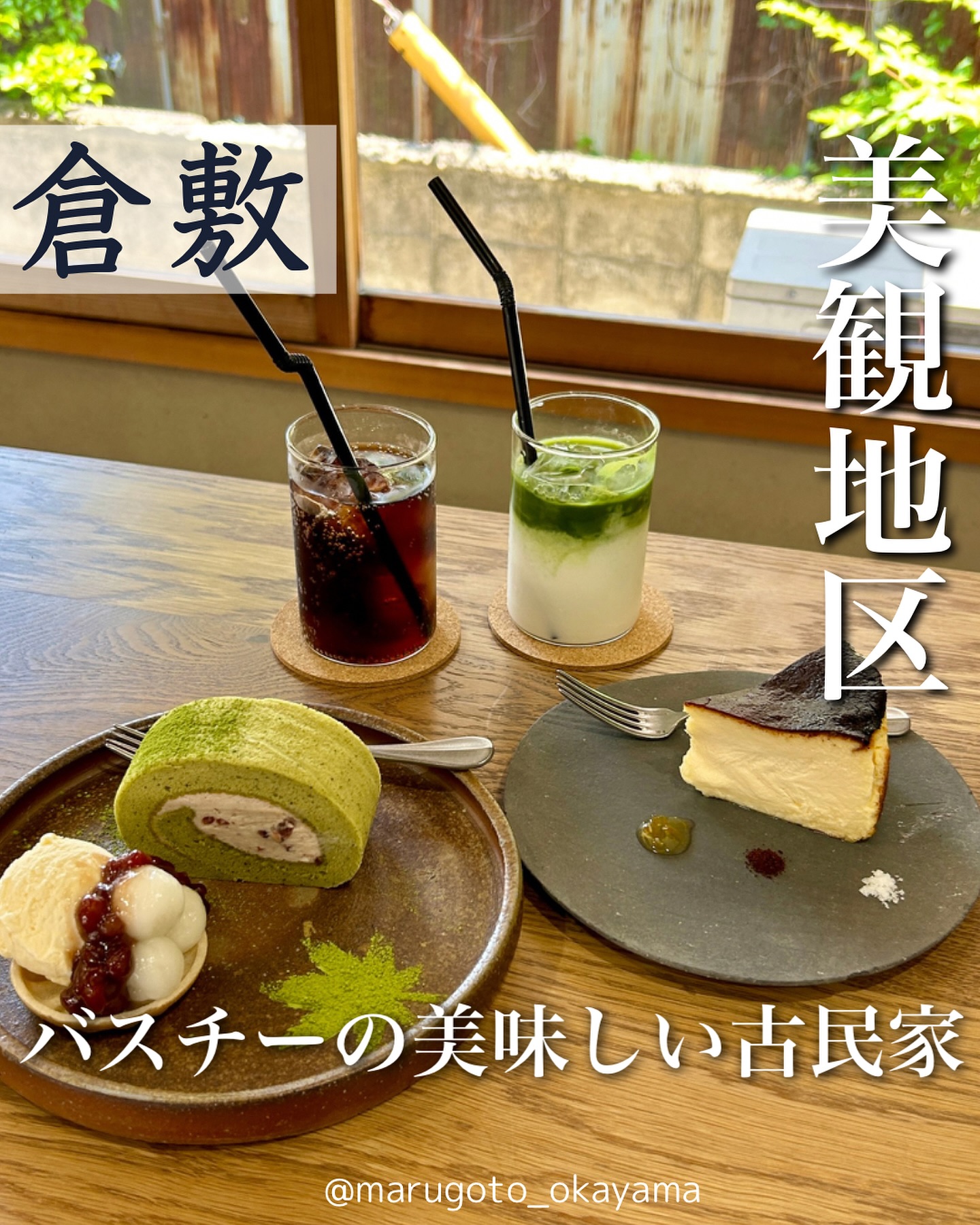 倉敷美観地区にある古民家を改装したカフェで、隠れ家風の落ち着いた雰囲気とテラス席が魅力です。名物はバスクチーズケーキで、抹茶ロールや和洋スイーツも楽しめます。ワンドリンク制。