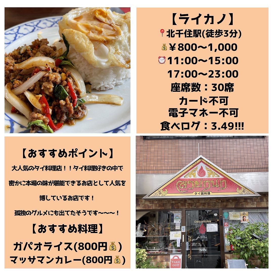 北千住の人気タイ料理店ライカノは、孤独のグルメにも登場した名店です。牛肉のガパオが特に人気で辛さは調整可能。ランチ11:30–15:00、ディナー17:00–23:00、月曜定休。30席、北千住駅徒歩3分。カード・電子マネー不可、ディナーのみ予約可。