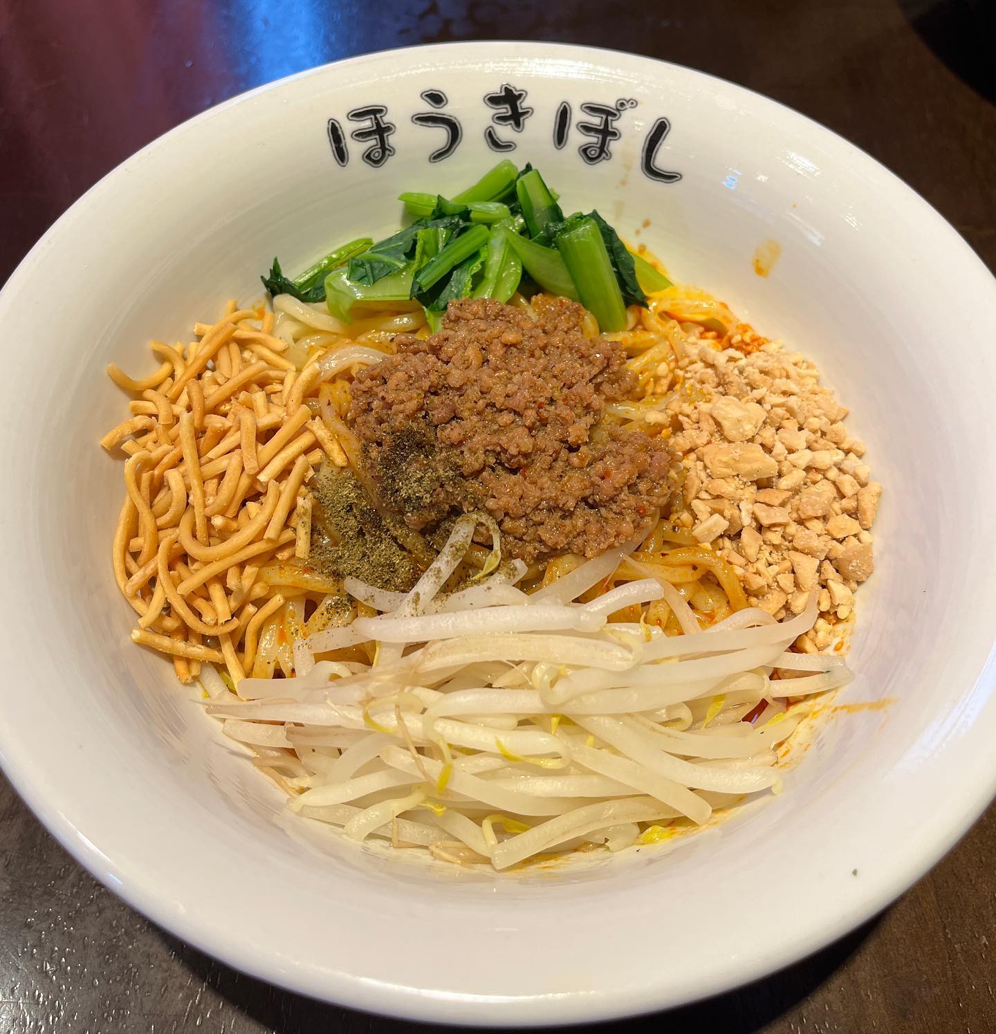 赤羽のほうきぼしは汁なし担々麺が有名だが、汁あり担々麺も楽しめる店。細麺のツルリ感と山椒・ナッツ・ひき肉の旨味が絡むスープが魅力。ご飯が欲しくなる味わいで、季節メニューに冷し系も登場。