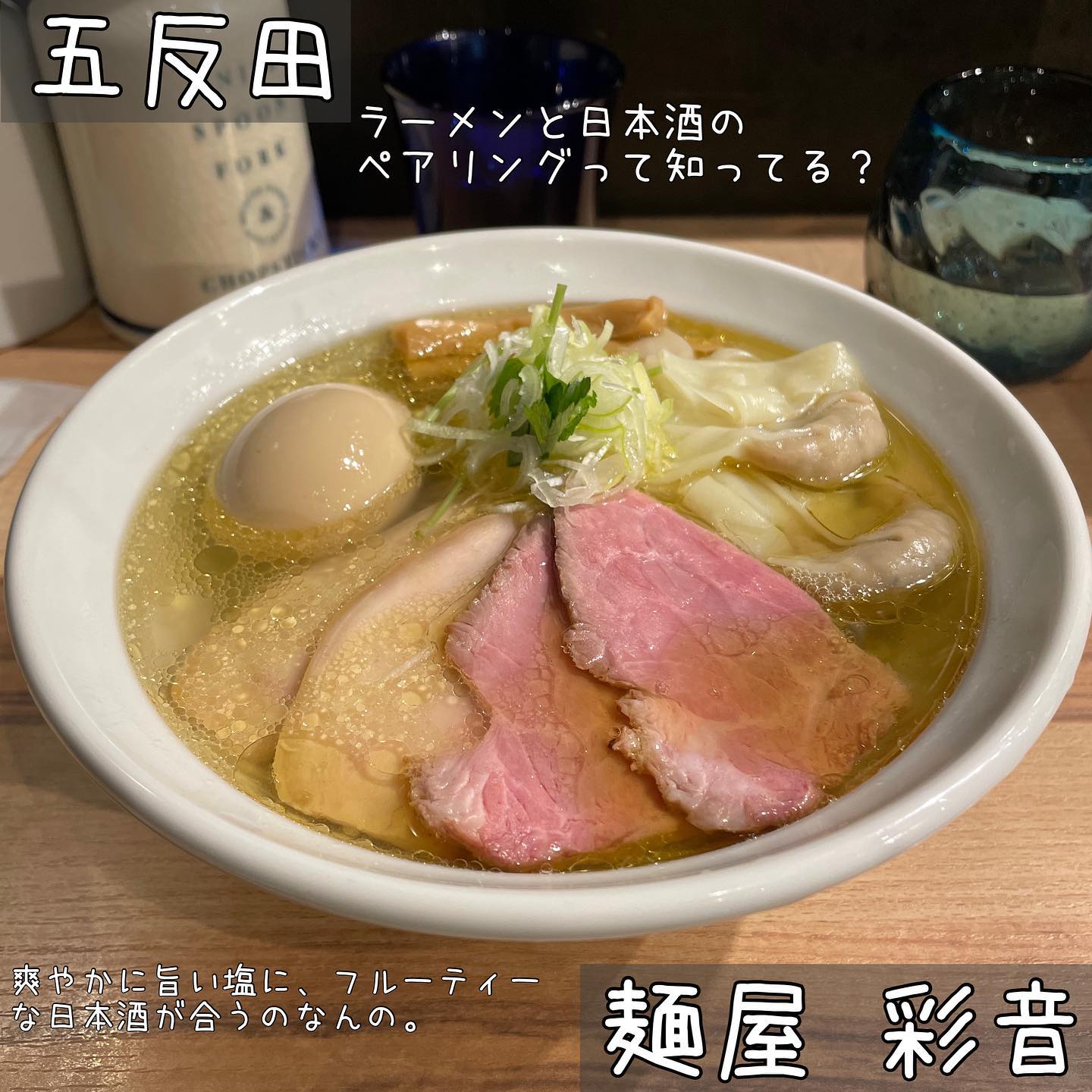 五反田の名店 麺屋 彩音 ~Sign~ は、金曜夜のみ23:30まで営業します。特製塩ラーメンは透き通る黄金スープと全粒粉麺が絶妙で、豚肩ロースと鶏胸のチャーシューに餡たっぷりワンタンが特徴です。日本酒ペアリングも楽しめ、ミシュラン掲載・食べログTop5000の実力店です。