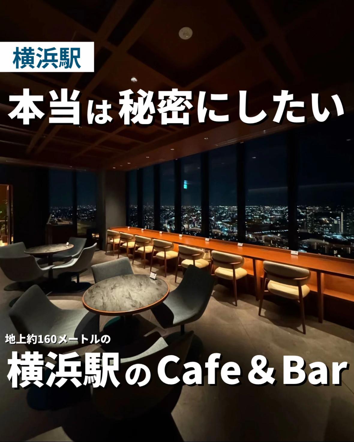 横浜駅徒歩3分、THE YOKOHAMA FRONT42階の skylounge cafe&bar mequ。地上約160mから横浜ベイエリアを一望でき、全席禁煙・Wi‑Fi・電源完備。7:00〜24:00、カウンター中心で一人利用にもデート利用にも最適。