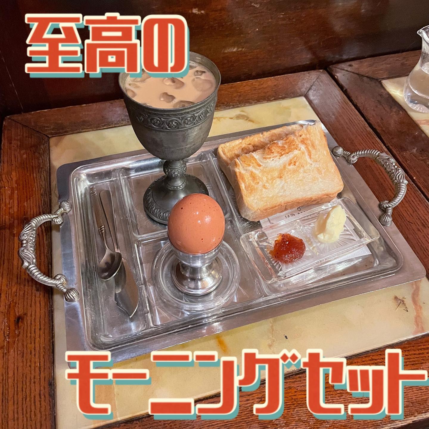 飲み物とトースト、ゆでたまご、ジャムバターがつい...