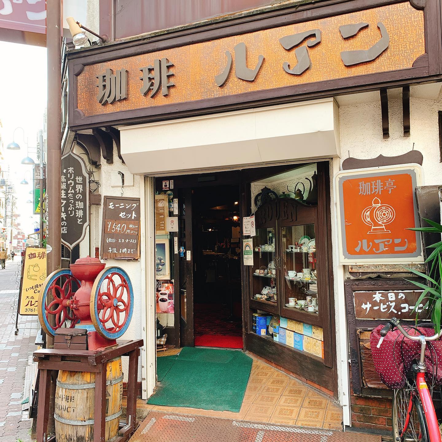 昭和レトロな純喫茶「珈琲亭ルアン」は、大森駅近くの静かな路地に佇む名店です。モーニングはボリューミーなセットで朝7時から開店。看板商品の『ベルサイユのばら紅茶』は、カップの底に生クリームがあり、注ぐと中央でくるくる回る演出が特徴です。