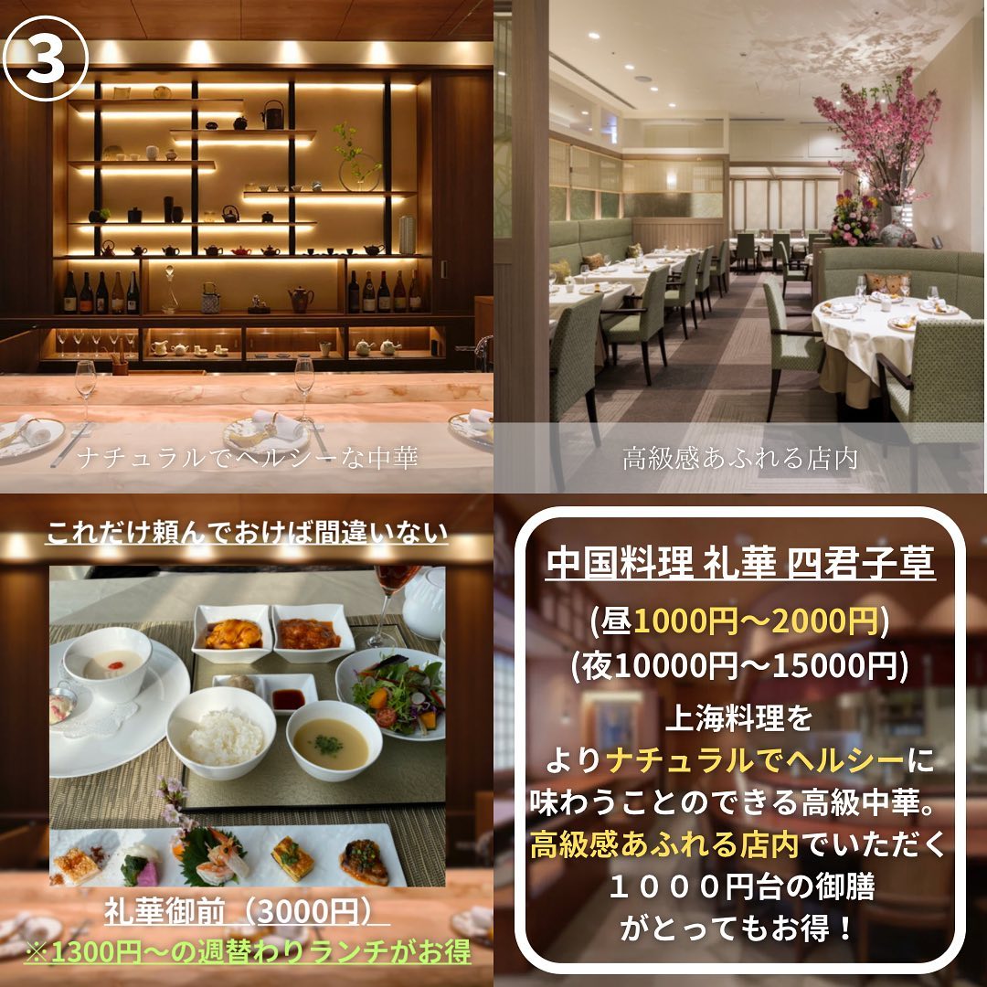 日比谷の東京ミッドタウン日比谷3階に位置する上海料理の名店です。筑紫楼の料理長を務めたシェフが腕を振るい、フカヒレ御膳(4,000円)をはじめ前菜の美しい盛り付けと胸びれ姿煮込みの濃厚スープが魅力です。緑豊かなテラス席も心地よい空間です。