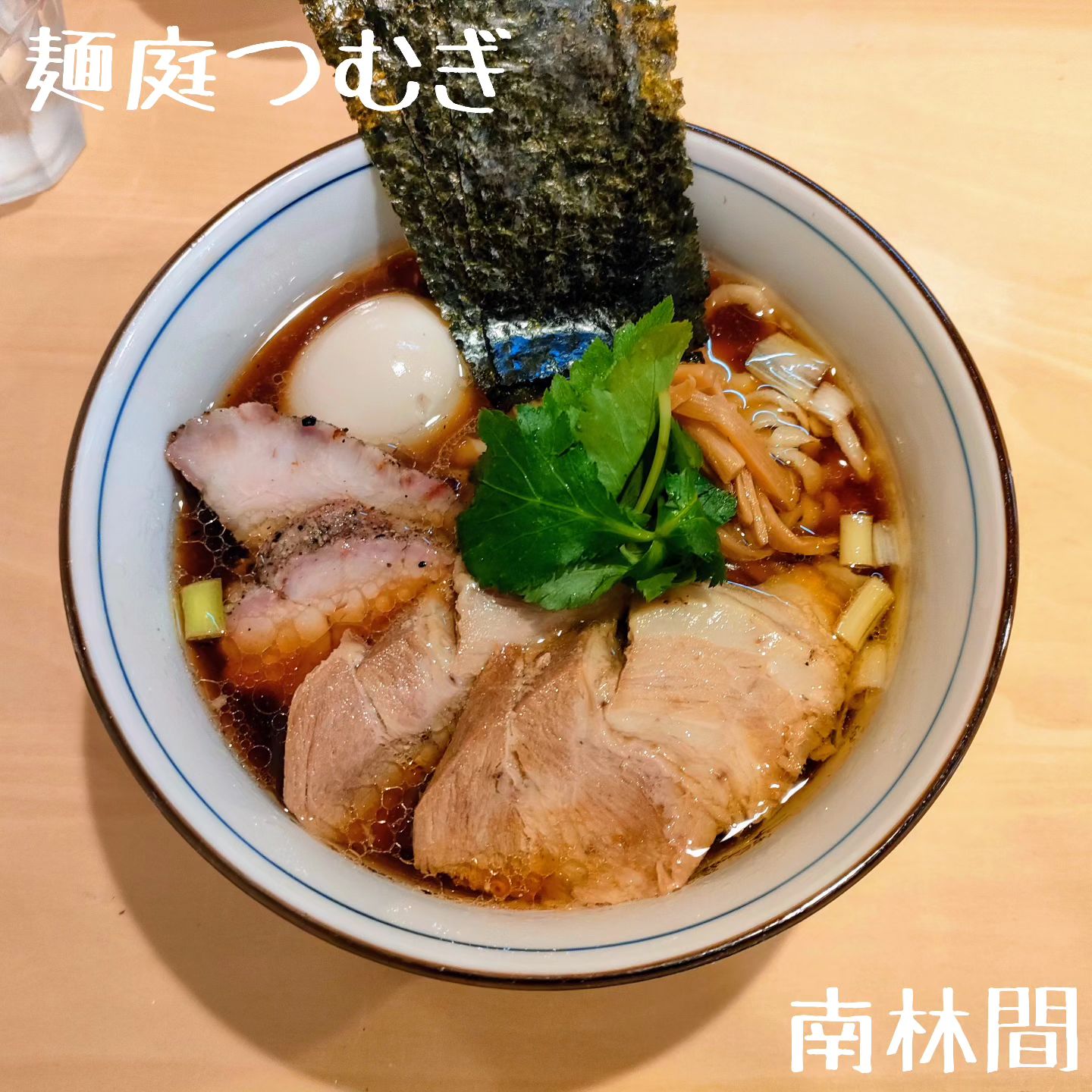 南林間の新店・麺庭つむぎは、自家製縮れ麺と軍鶏香る醤油清湯が魅力。醤油の塩梅が絶妙で、肩ロースと豚バラの2種チャーシューの食感も楽しめます。人気店ながら完成度の高い一杯。