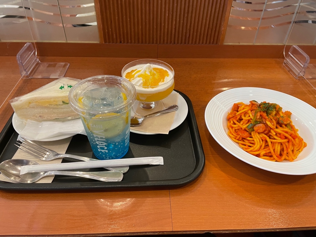 カフェベローチェは、抹茶ケーキ(3層)やダルゴナケーキなどのスイーツと、揚げナスとベーコンの香ばし醤油風サンドやプルコギビーフの焼き立てサンドなど多彩なメニューを揃えるカフェです。アイスティー・アイスコーヒー・ラッシーも充実しています。