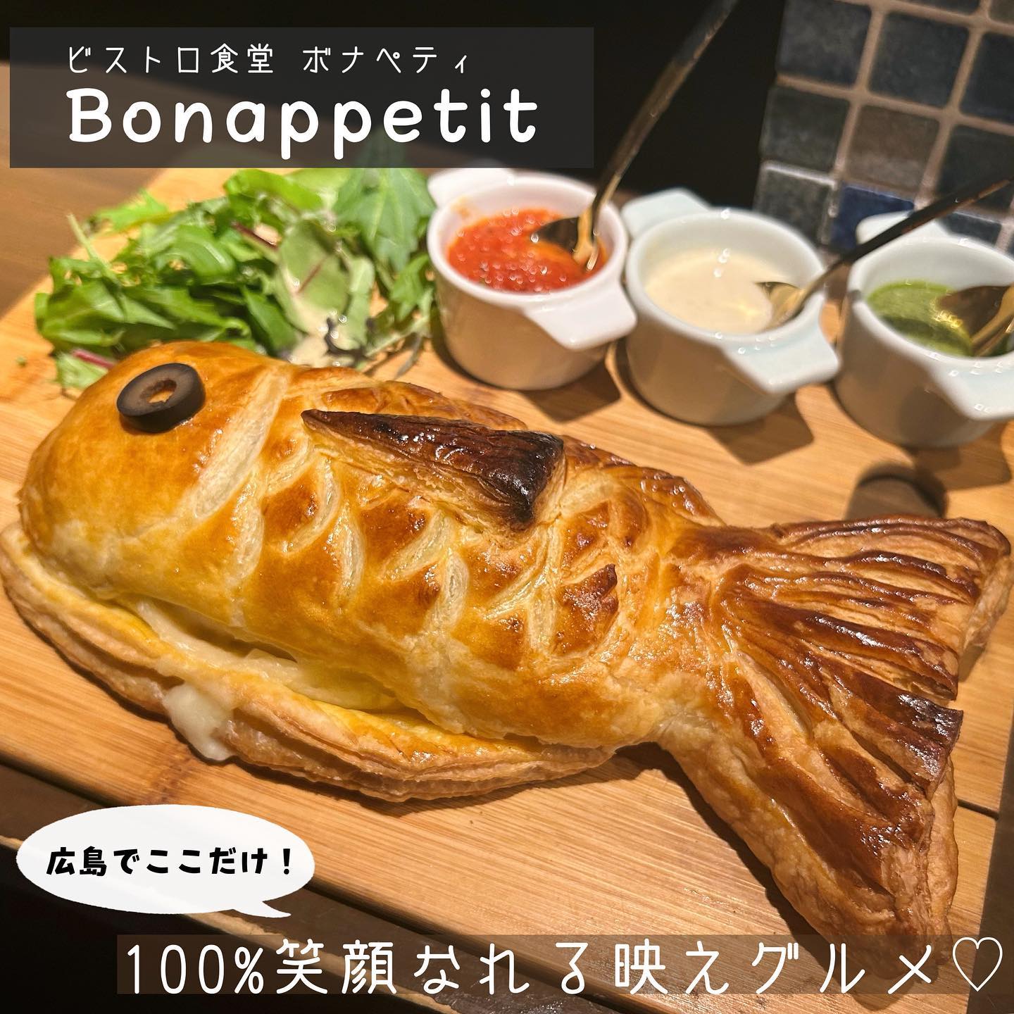 広島駅近くのボナペティは、洋食とワインを中心にしたカジュアル創作料理が魅力のビストロです。事前予約限定の魔女のパイ包みコース4,980円には2時間の飲み放題が付き、日替わりの魚介を使った手作りパイと魚の模様が特徴です。魔女の世界観の演出も写真映えします。