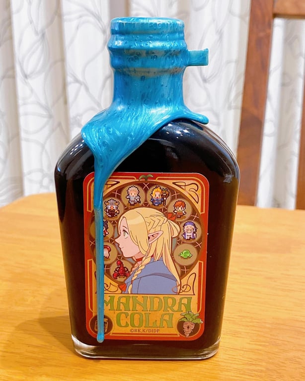 当店では『ダンジョン飯』コラボのオリジナルクラフトコーラ『マンドラコーラ』を取り扱っています。黒く浮くマンドレイクの繊維が特徴で、一見インパクト大ですが、味は上品なクラフトコーラです。