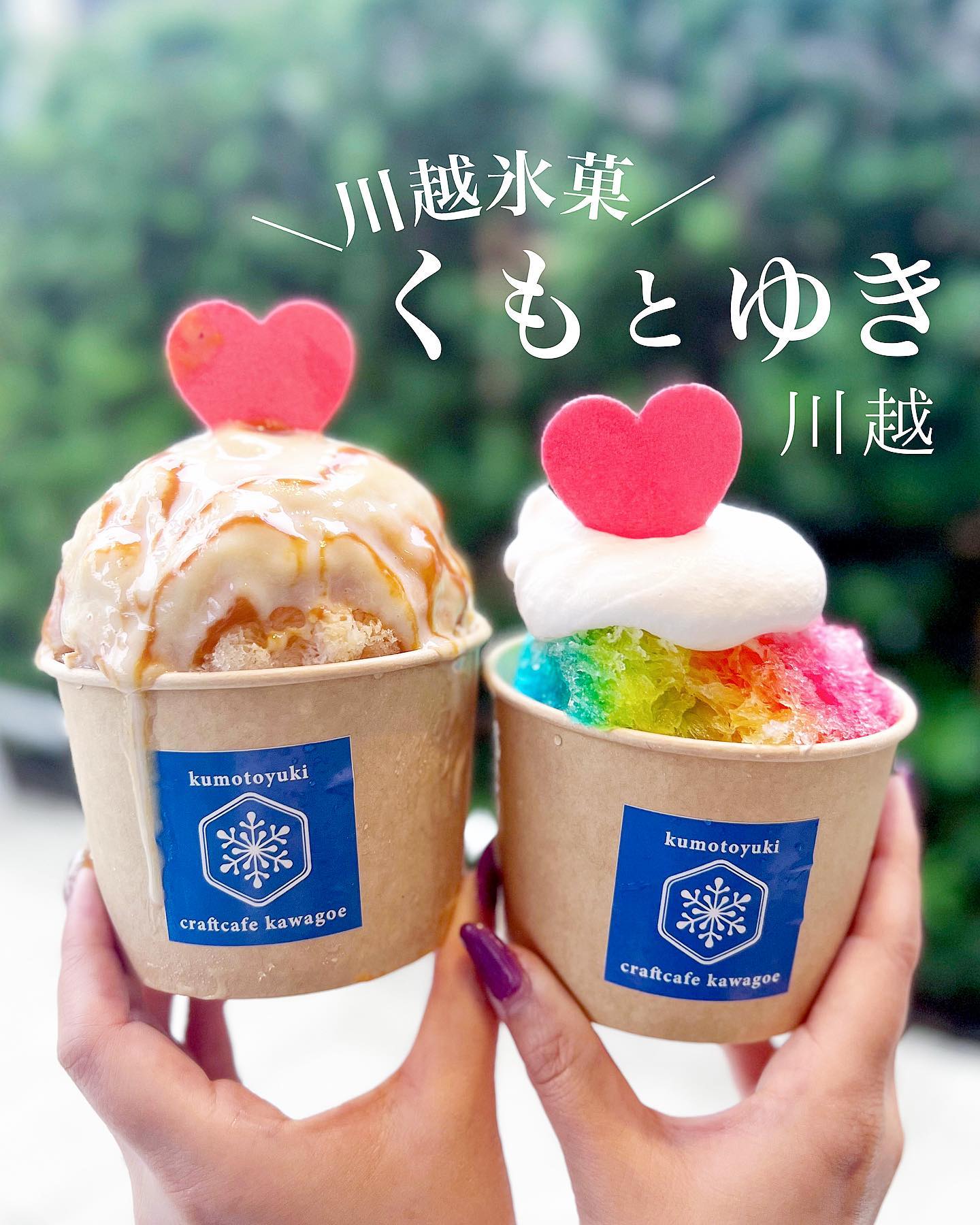 川越氷菓 くもとゆきは、ふわふわかき氷とレインボー氷が楽しめる専門店です。縁結び横丁・旅籠小江戸や1Fフードコートに出店しており、シロップ・ベースを自由にカスタムできます。体験メニューも充実しています。