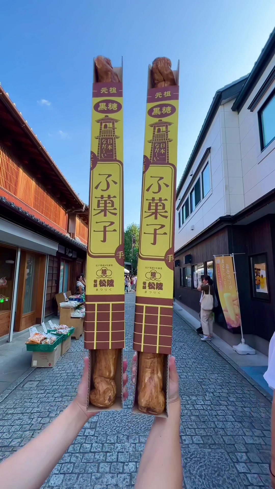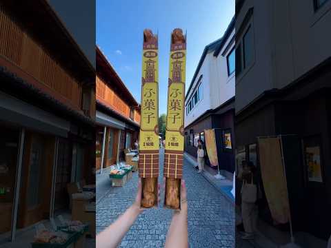 川越・菓子横丁の松陸製菓は、日本一長いふ菓子が名物のお店です。店頭には80cmと95cmの2種があり、95cmは手作りで沖縄産糖蜜黒糖を使用。価格は650円、営業時間は10:00〜17:00。