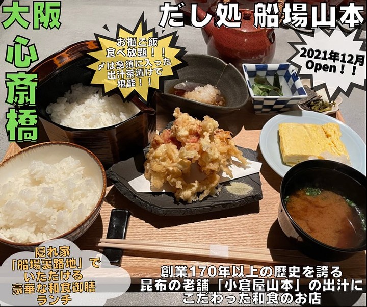 創業170年以上の昆布老舗・小倉屋山本の出汁にこだわる和食店、だし処船場山本。鶏天とだし巻き、昆布締めなどをお櫃ご飯とセットで提供。締めの出汁茶漬けが絶品の隠れ家ランチです。