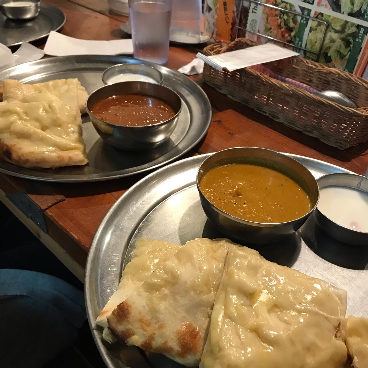 チーズナンとバターチキンカレーのセットで普通ナンおかわり自由のハッピーセット🌟チーズが増した?めっちゃ伸びたし増し増しな...