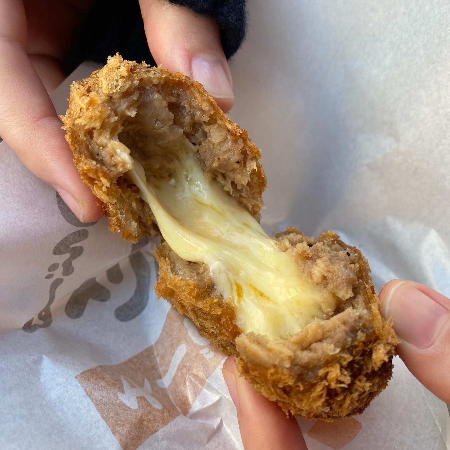 のび~るチーズがたまらない「雷門チーズメンチ」が最高!東京・浅草にある「くろげ」で食べられます! #東京グルメ #浅草グルメ #チーズメンチカツ