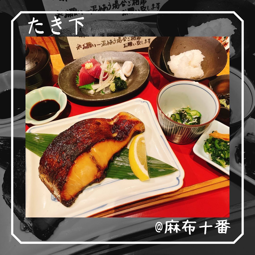 麻布十番のたき下は、備長炭の焼台で丁寧に焼く焼魚が自慢の和食店です。皮はパリッと身はふっくらの黒むつ柚香焼きが看板で、ランチには刺身を添える欲張りセットも人気。ご飯と大根おろしはおかわり自由、3品の小鉢と味噌汁で満足感高めです。