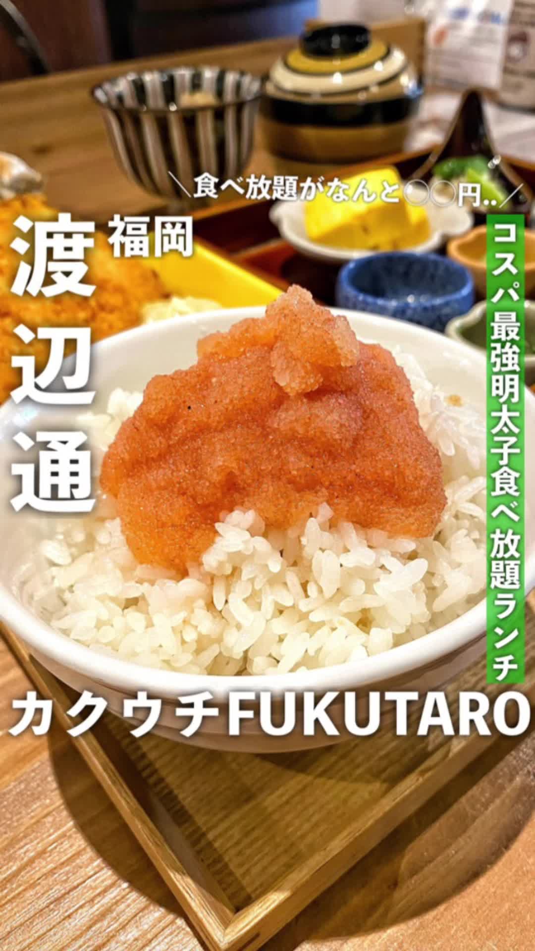カクウチFUKUTAROは渡辺通のオシャレな居酒屋スタイルの店。天神南駅から徒歩1分、80席。掛け流し明太子膳は1,000円台で話題、全品コスパ良好。バター溢れるチキンカツランチは1,380円でご飯おかわり自由。