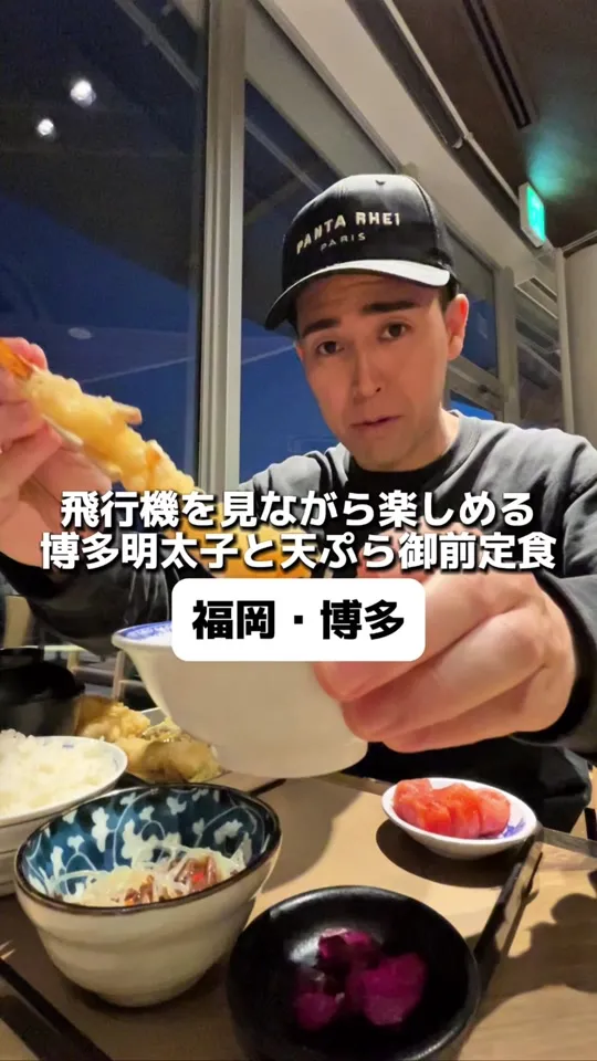 飛行機を見ながら楽しめる博多明太子と天ぷら御前定食→...