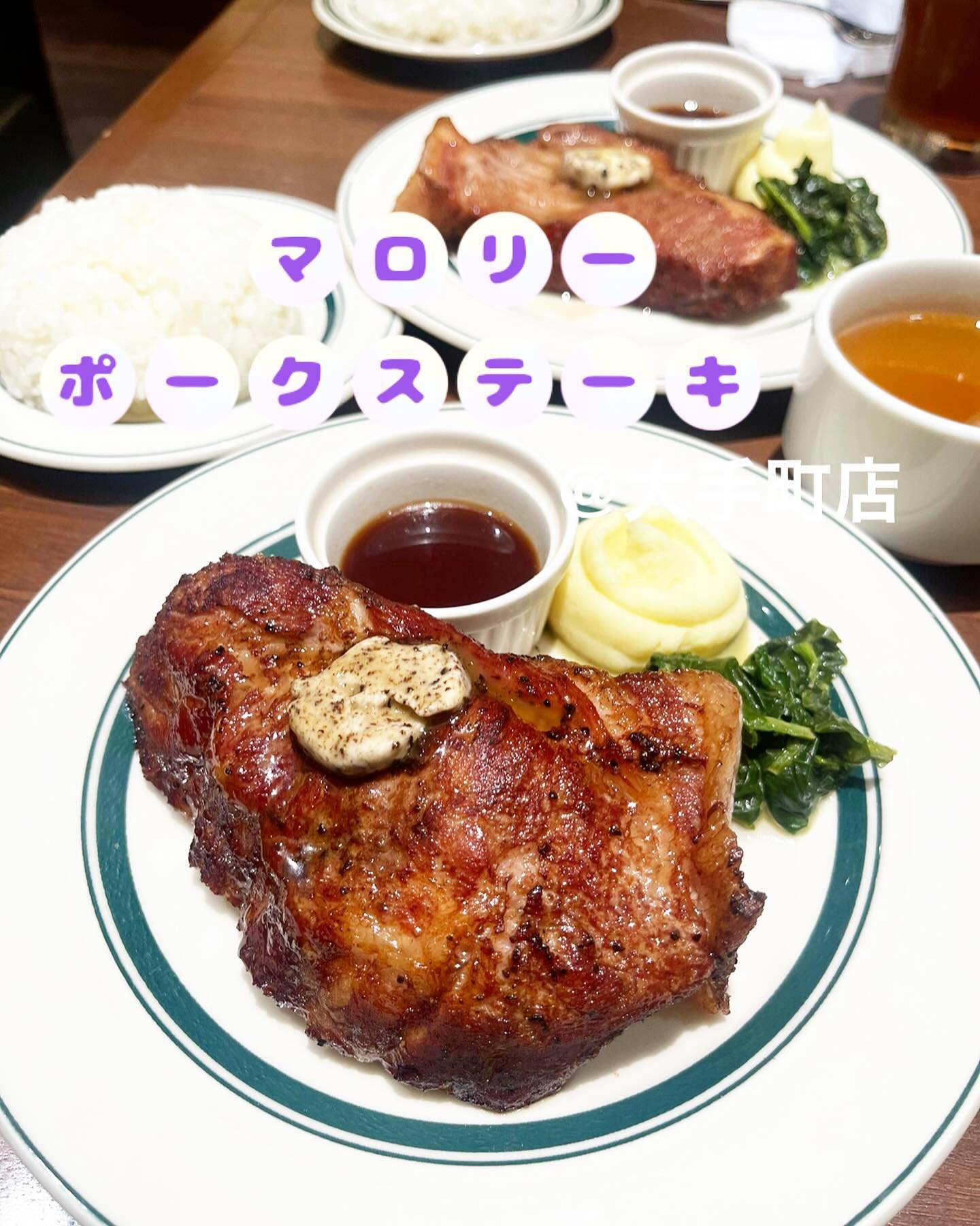 大手町のマロリーポークステーキ店は、塊肉のポークステーキを山名でサイズ表示するユニークな専門店。72時間低温熟成後、表面を香ばしく焼き上げます。200g〜最大2kgまで対応。予約推奨。