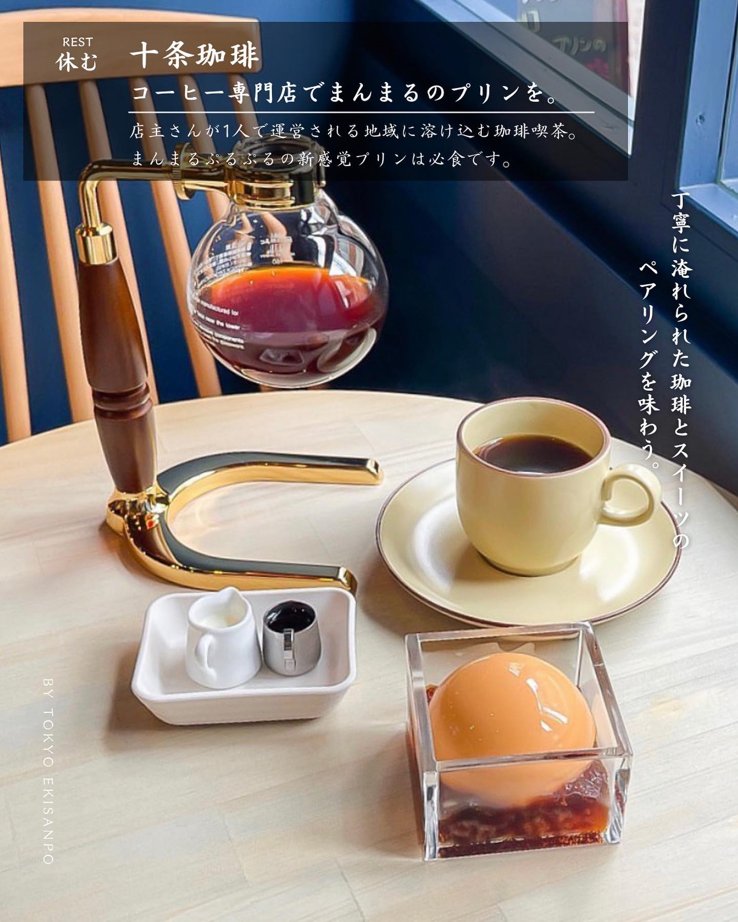 十条珈琲は十条駅近くの珈琲店。特徴はシン・プリン。まんまるプリンをスクエアの器に入れ、底にはカラメルジュレ。別添えのカラメルとミルクで味変。スペシャルティコーヒーと組み合わせて楽しめます。プリン700円、十条ブレンド450円。