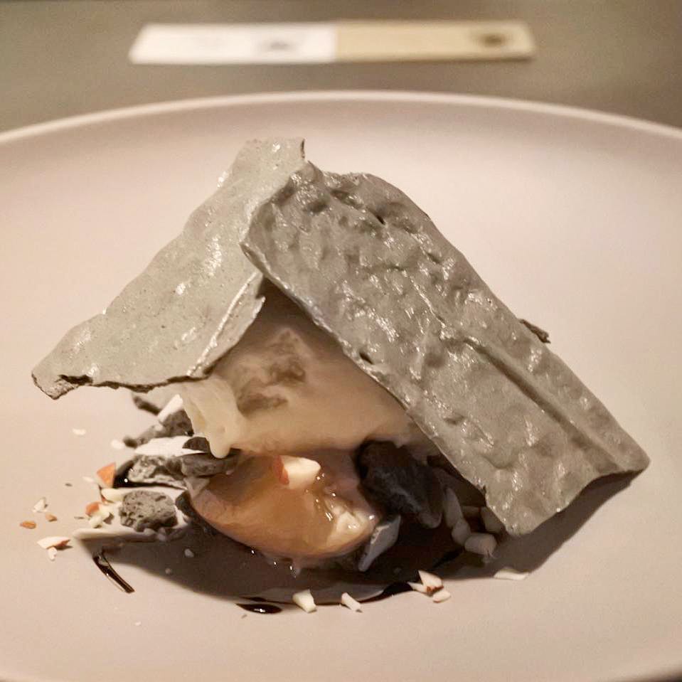 賛否両論ありそうな、DOLCE「桃 アーモンドジェラート 竹炭メレンゲ」の風貌。見るからに甘さを排除した風貌。カウンターと同化するインダストリアルなルックス。し...