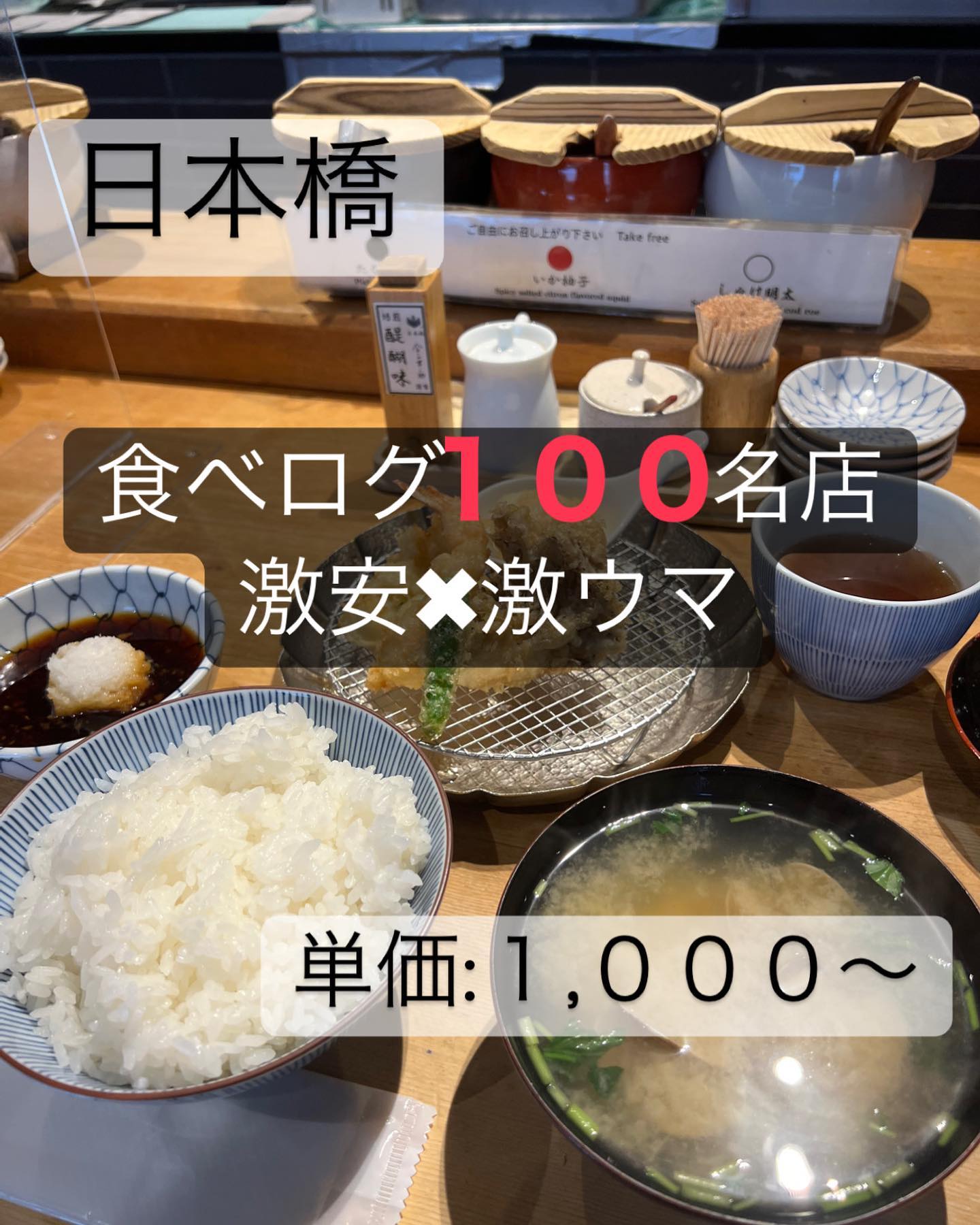 日本橋本町の天ぷら専門店 天ぷらめし 金子半之助は、目の前のたくあん・いか柚子・しゃけ明太が食べ放題で、揚げたての天ぷら9種を楽しめます。ご飯と味噌汁付きで天ぷらめし1,300円とコスパが良好です。
