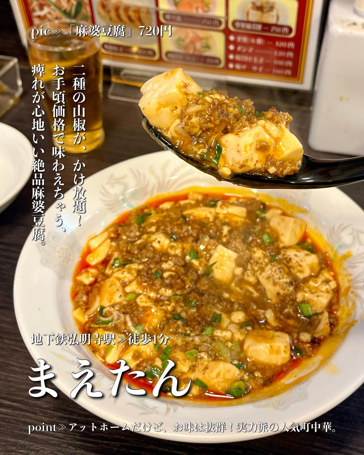 弘明寺の町中華「まえたん」は、濃厚な担々麺と本格四川麻婆豆腐が自慢です。卓上の山椒ミルはかけ放題で辛さを自由に調整。餃子も評判で、ランチ定食や居酒屋利用も可能です。アットホームな雰囲気の店です。
