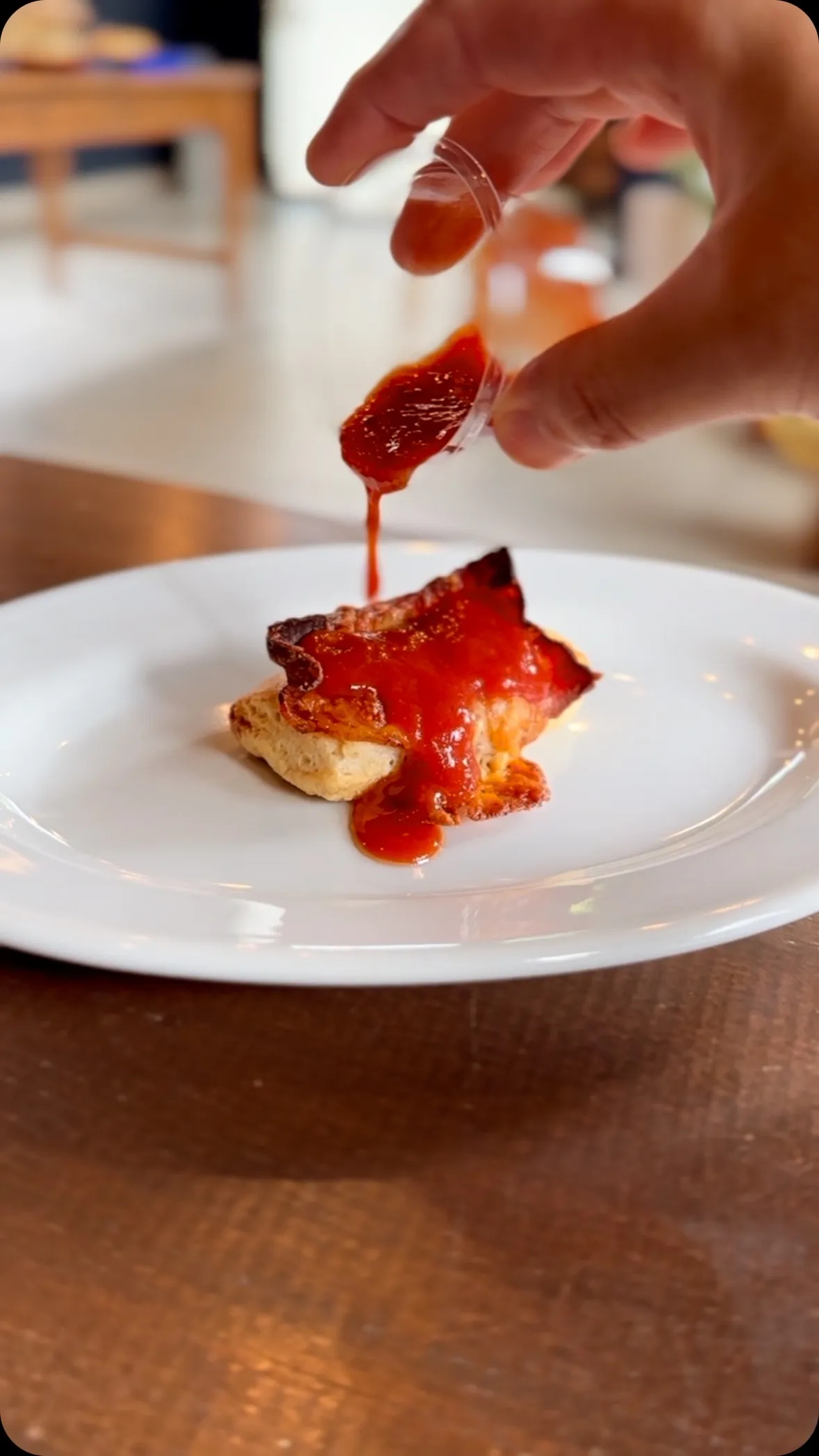 Scone Factory Glasgowは10:30-15:30に営業。夏季限定の『パイナップル×シークワーサー』や『ベーコン×チーズ×サルサ』など個性派スコーンが楽しめます。サルサは食べる直前にかけるスタイルです。TEL 080-9406-2323