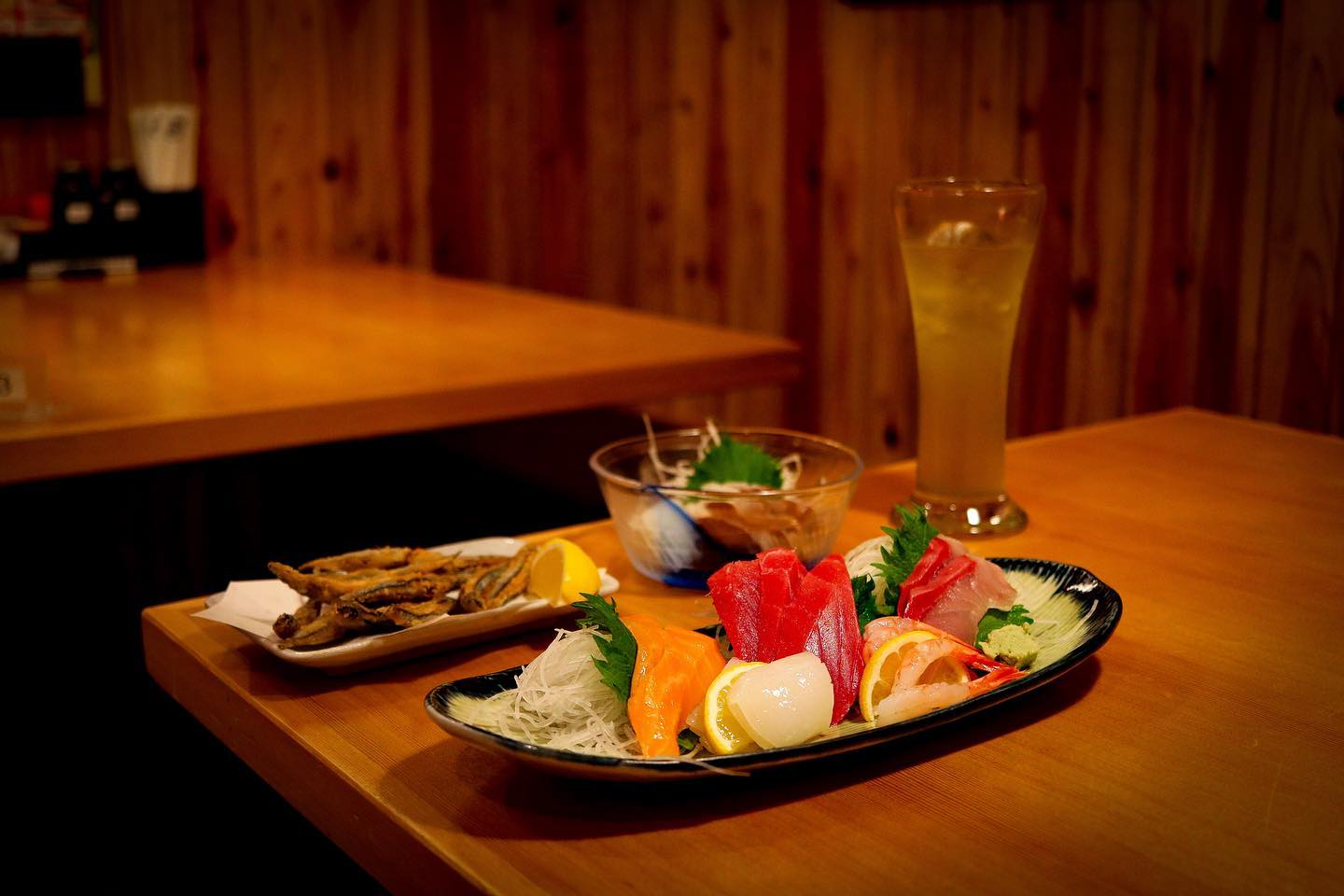 駅チカの居酒屋で気軽に海鮮を楽しめます。梅酒緑茶など珍しいお酒や沖縄のシークワーサー酒も揃い、刺身盛り合わせと胡椒強めの手羽先が特におすすめ。えんがわユッケやいか肝イルベ、カニ風サラダ、かにみそ天ぷら、うまきも絶品です。