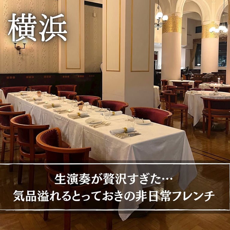 横浜・日本大通りのフレンチ店。中世ヨーロッパのお城のような店内で、ピアノとヴァイオリンの生演奏を聴きながら、旬を活かした繊細な料理と高級食材を堪能できます。特別な日やデートに最適で、1人約2万円前後です。