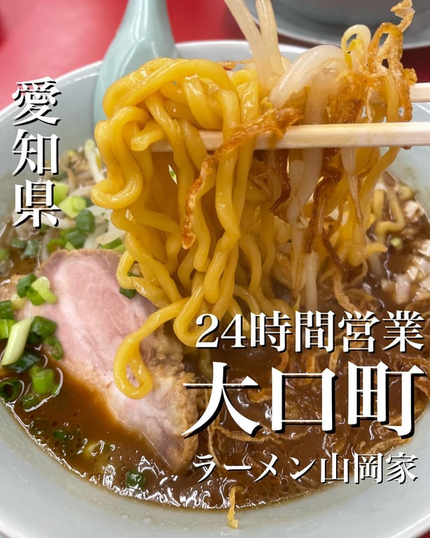 愛知県丹羽郡大口町の山岡家は、赤を基調とした大衆的な店内で24時間営業します。看板メニューは辛味噌ラーメンと辛味噌チャーシュー麺で、濃厚スープと中太麺がよく絡みます。敷地内約25台の駐車場と39席、利便性も魅力です。