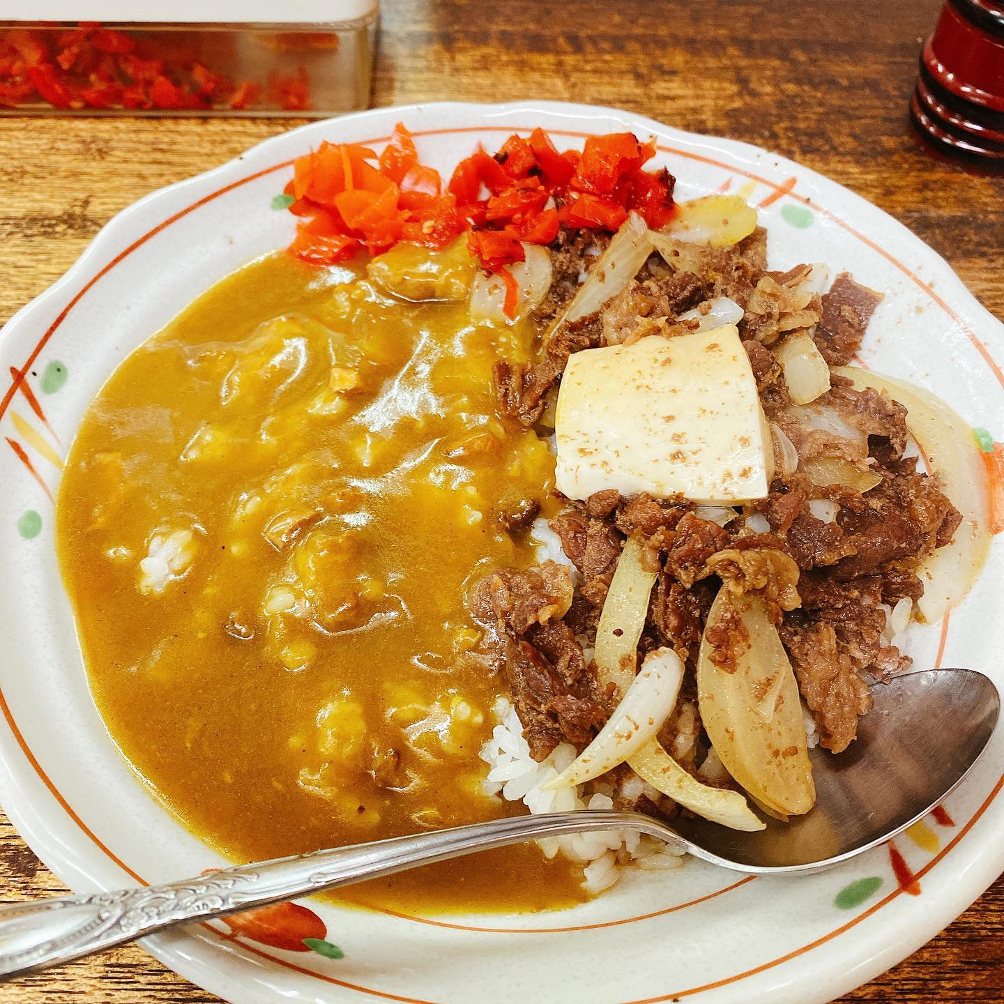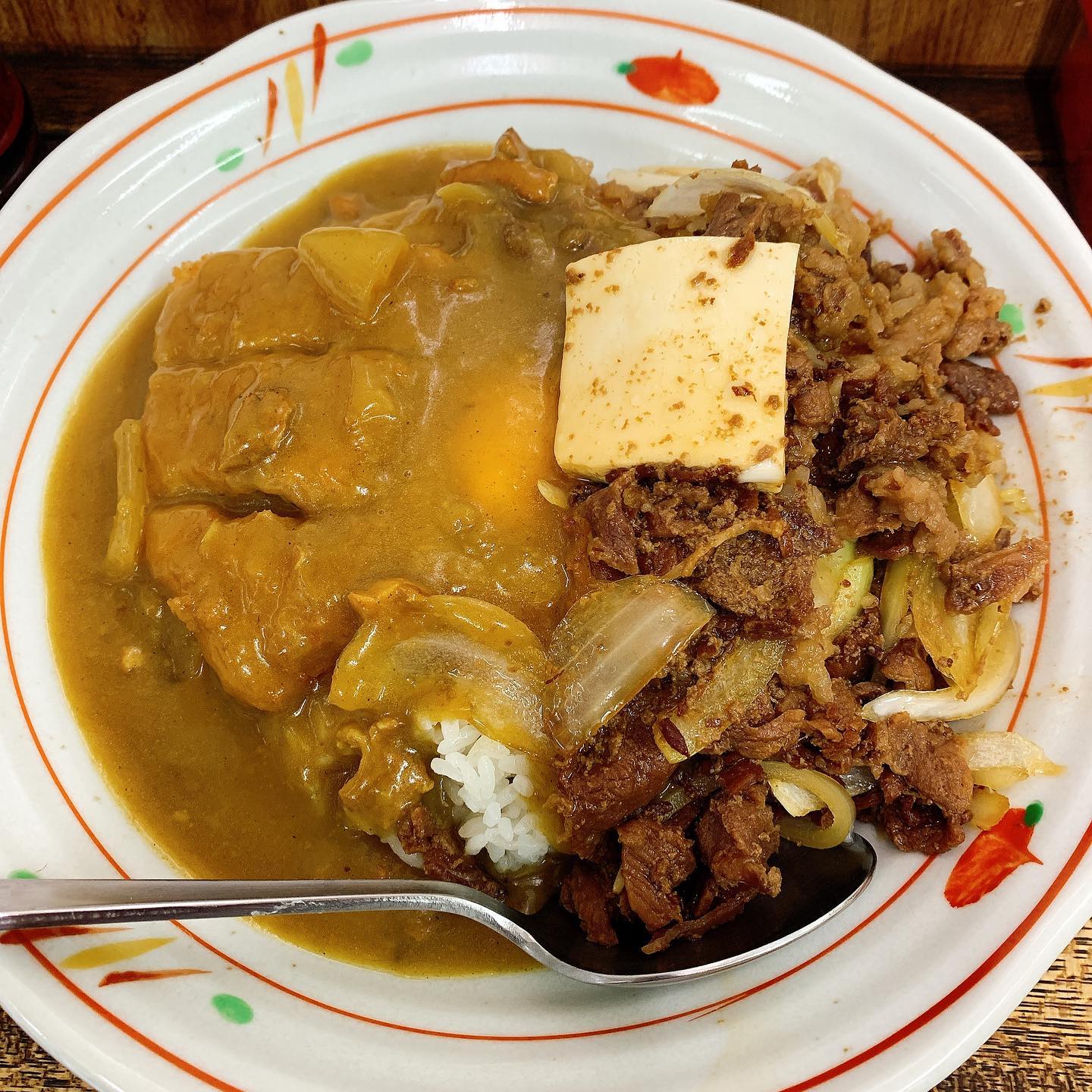 メニューは牛めし、カレー、トンカツで「三品」とのことで、せっかくなら全部載せ的なカツ...