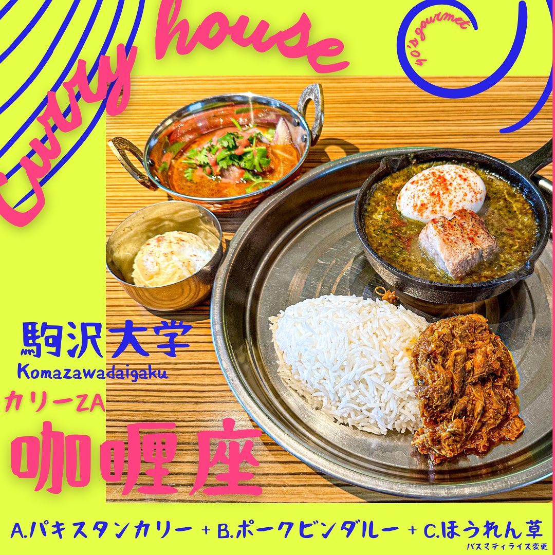 駒沢大学エリアのスパイスカレー店。汁なし濃厚チキンカレーと濃厚ほうれん草カレー(チーズ入り)、ポークビンダルーの三種が楽しめます。ぷつぷつした食感のバスマティライスが相性抜群で、味の複雑さとバランスが魅力。次はカシミールもお試しください。