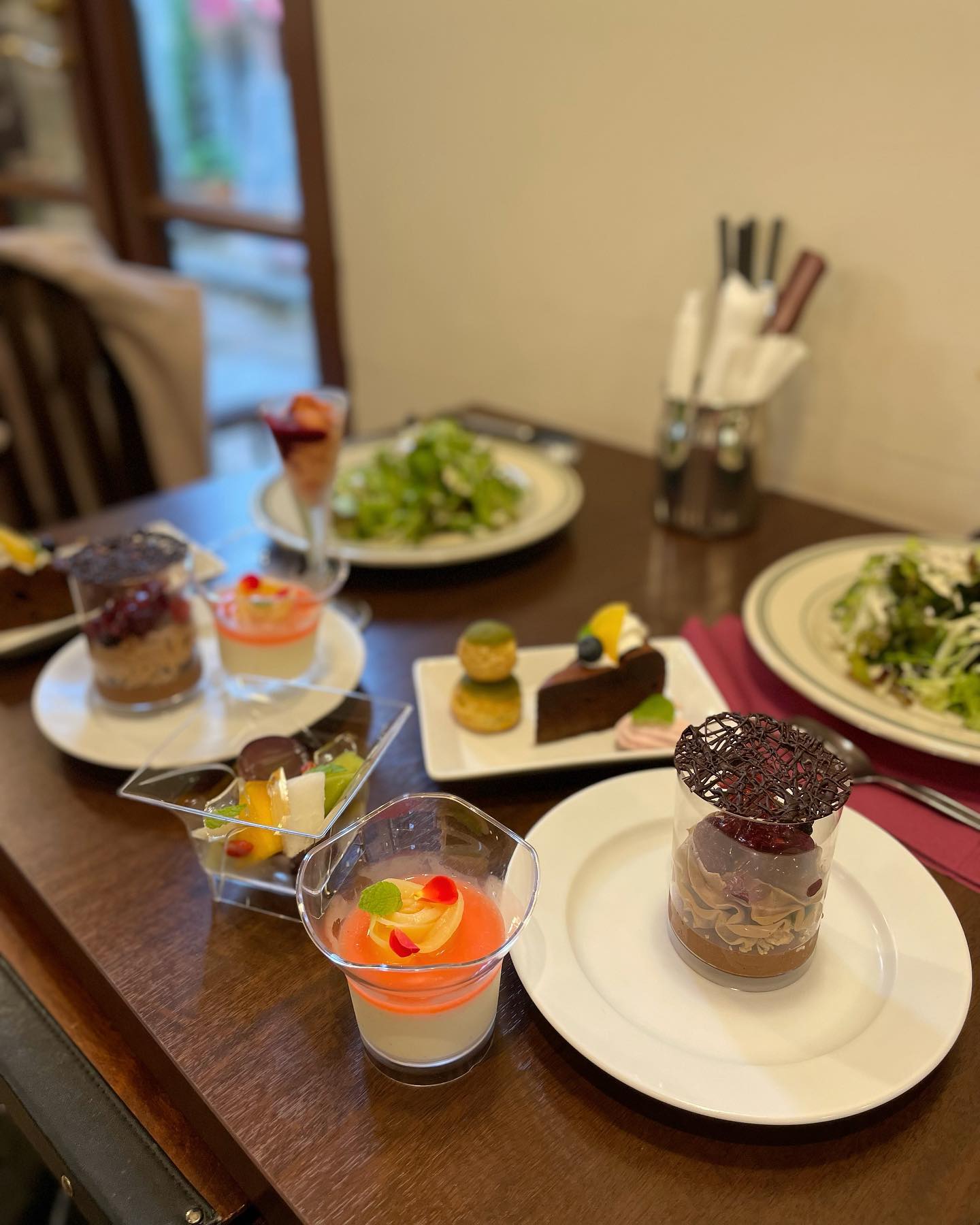 ニューヨークグリル&カフェ ショウカは、フィオーレの森の中にある店で、完全屋外テラス席とペット同伴OKが魅力です。約30種類の手作りデザートが並ぶデザートブッフェ付きコースを、サラダ・メイン・デザートブッフェ・紅茶またはコーヒー付きで3,500円、90分で楽しめます。