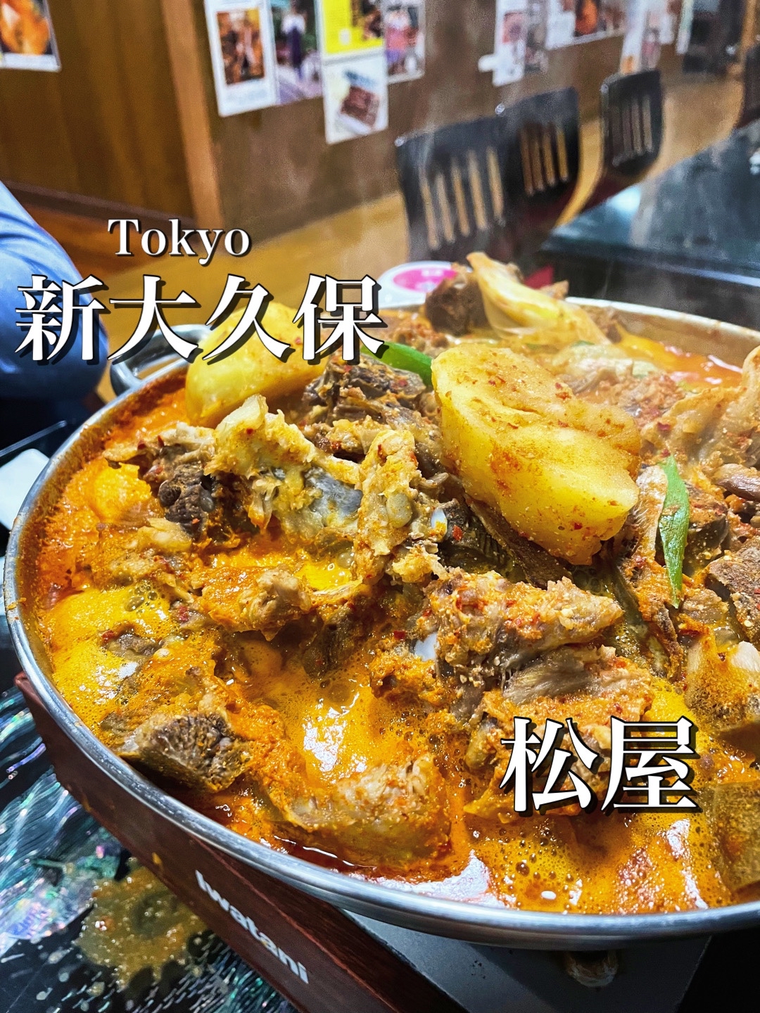 新大久保・東新宿の韓国料理店・松屋のカムジャタンは名物。骨付き肉とジャガイモを煮込んだ深い旨味の鍋で、辛さは控えめ。チャプチェもおすすめで、本場の雰囲気を楽しめます。