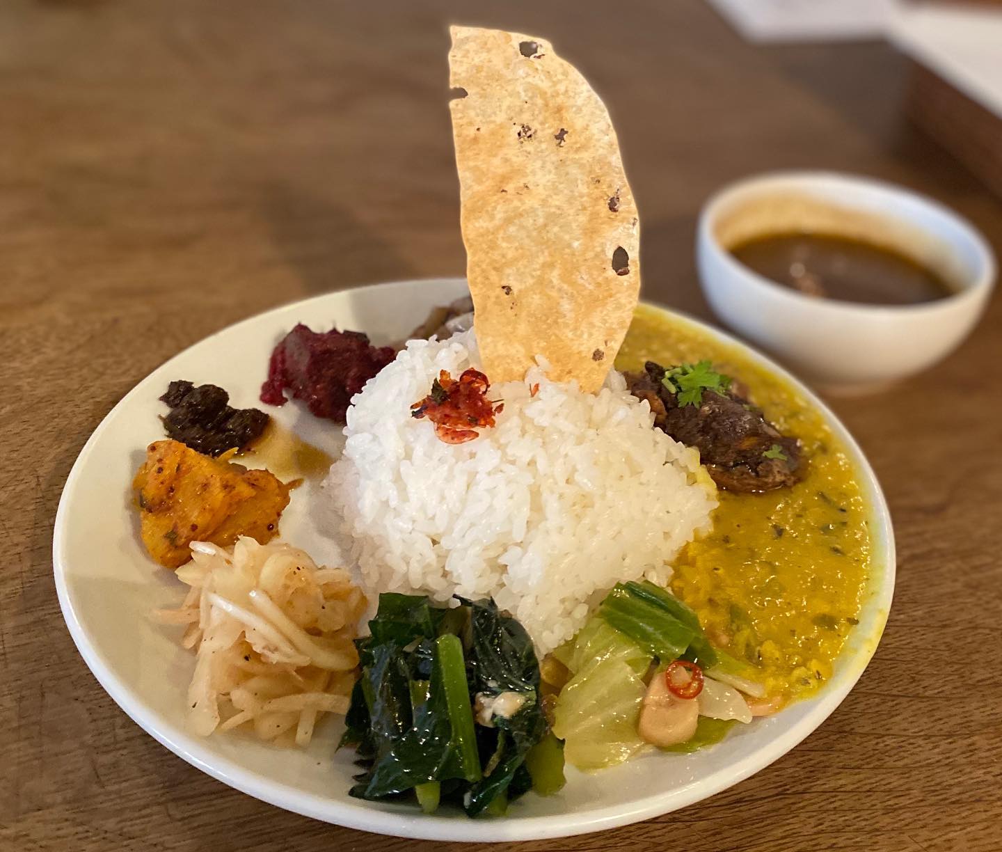 タンブリンカレーアンドバーは、本場スリランカのカレーとスパイス料理を楽しめるお店です。色とりどりの野菜が盛られたプレートが印象的で、薬草感のあるラッサムが食欲をそそります。夜はバーとしても過ごせ、落ち着いたソファ席が居心地良いのが特徴です。