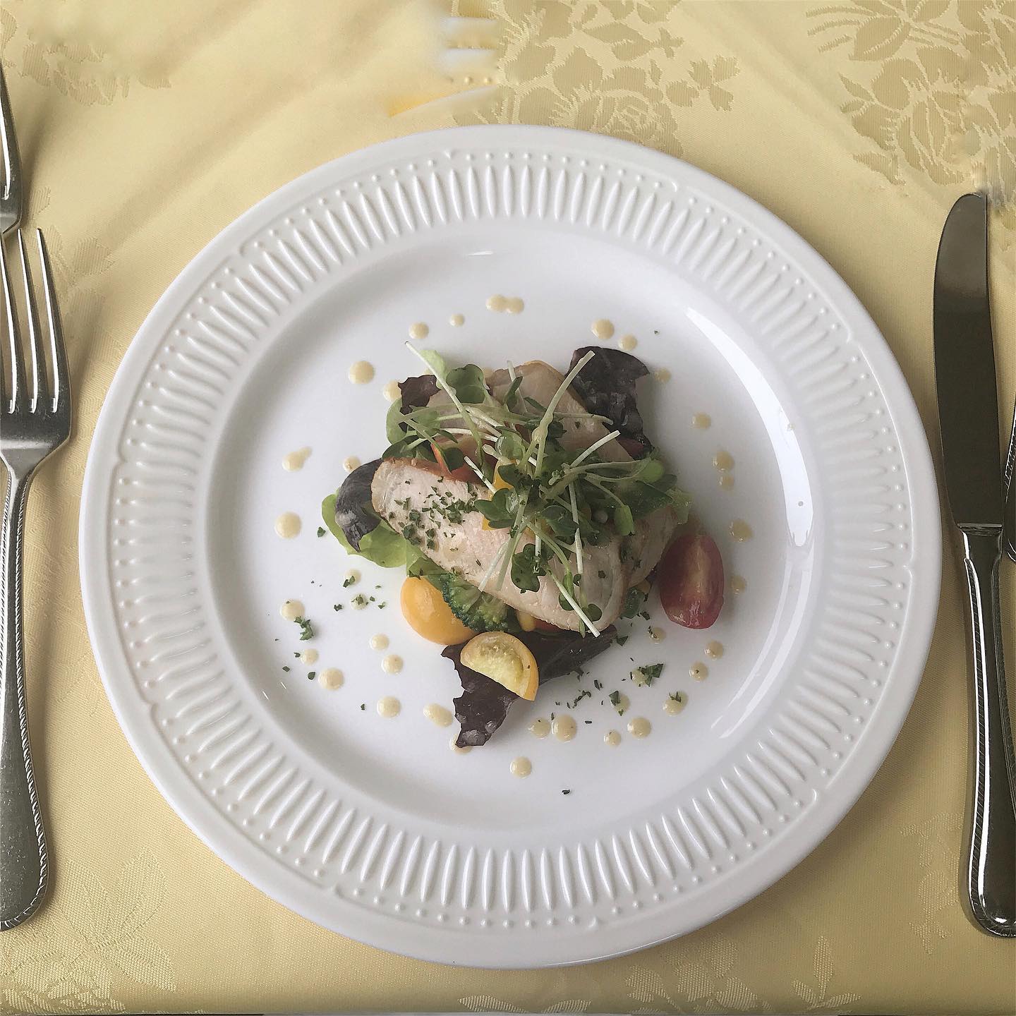蒜山の景色を楽しみながら味わえる、Green Gablesのフランス料理店です。ランチはコースのみで、前菜・スープ・魚・肉・デザートに飲み物とパンが付き、3,000円。どの料理も丁寧に盛り付けられ、彩りが美しいのが特徴です。