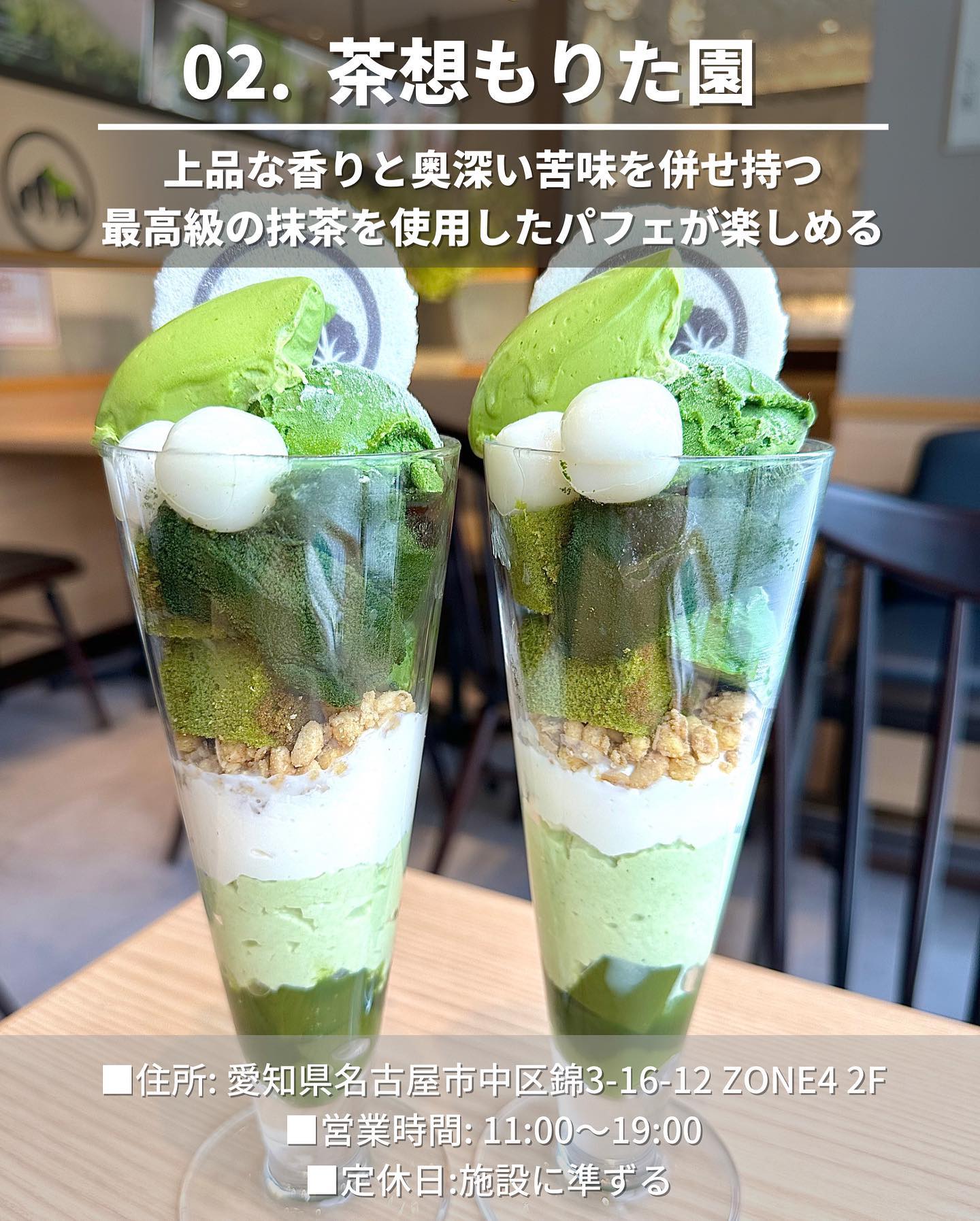 名古屋・栄の茶想もりた園は、京都宇治の高級抹茶を使ったスイーツと食事が楽しめるカフェです。宇治茶プレートには抹茶プリン・モンブラン・おだんごが一皿で楽しめます。お茶づくしパフェも魅力です。ZONE4 2F、栄駅から徒歩2分。