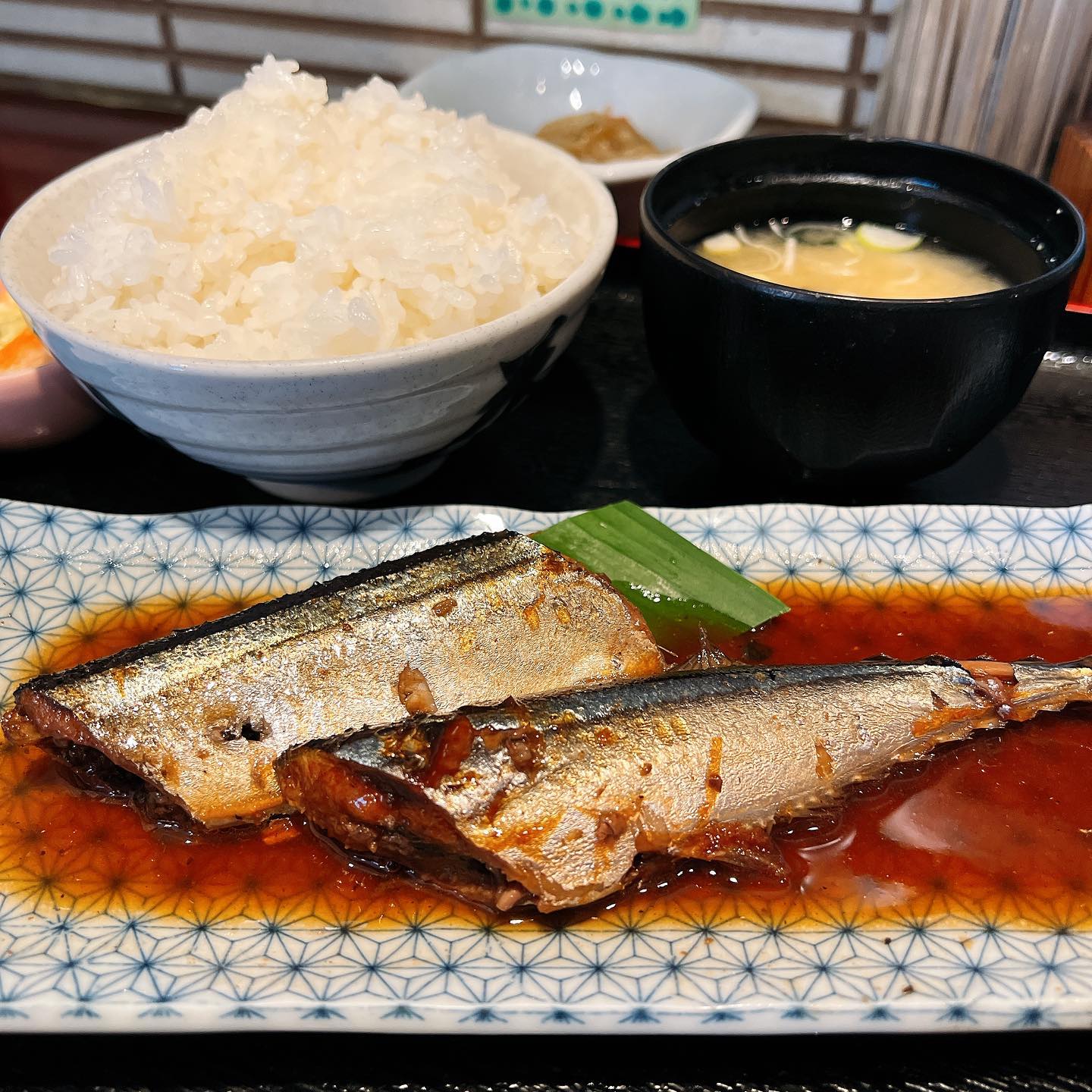 サンマの煮付定食(ご飯大盛無料、味噌汁、漬物、小鉢付)820円。