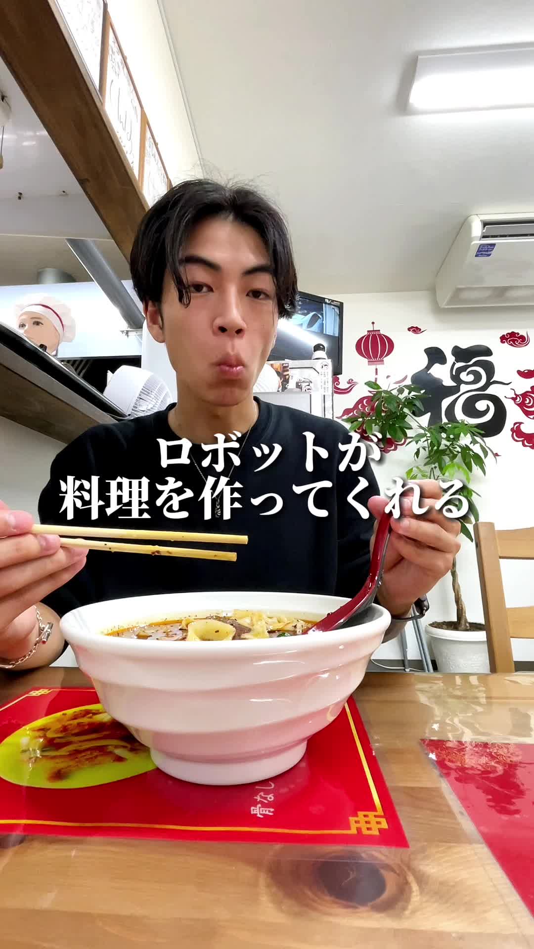 パンチの効いた辛さがクセになる刀削麺🍜店内ではスゴ腕のロボットが麺を削ってた!麺の食感はもちもちで...