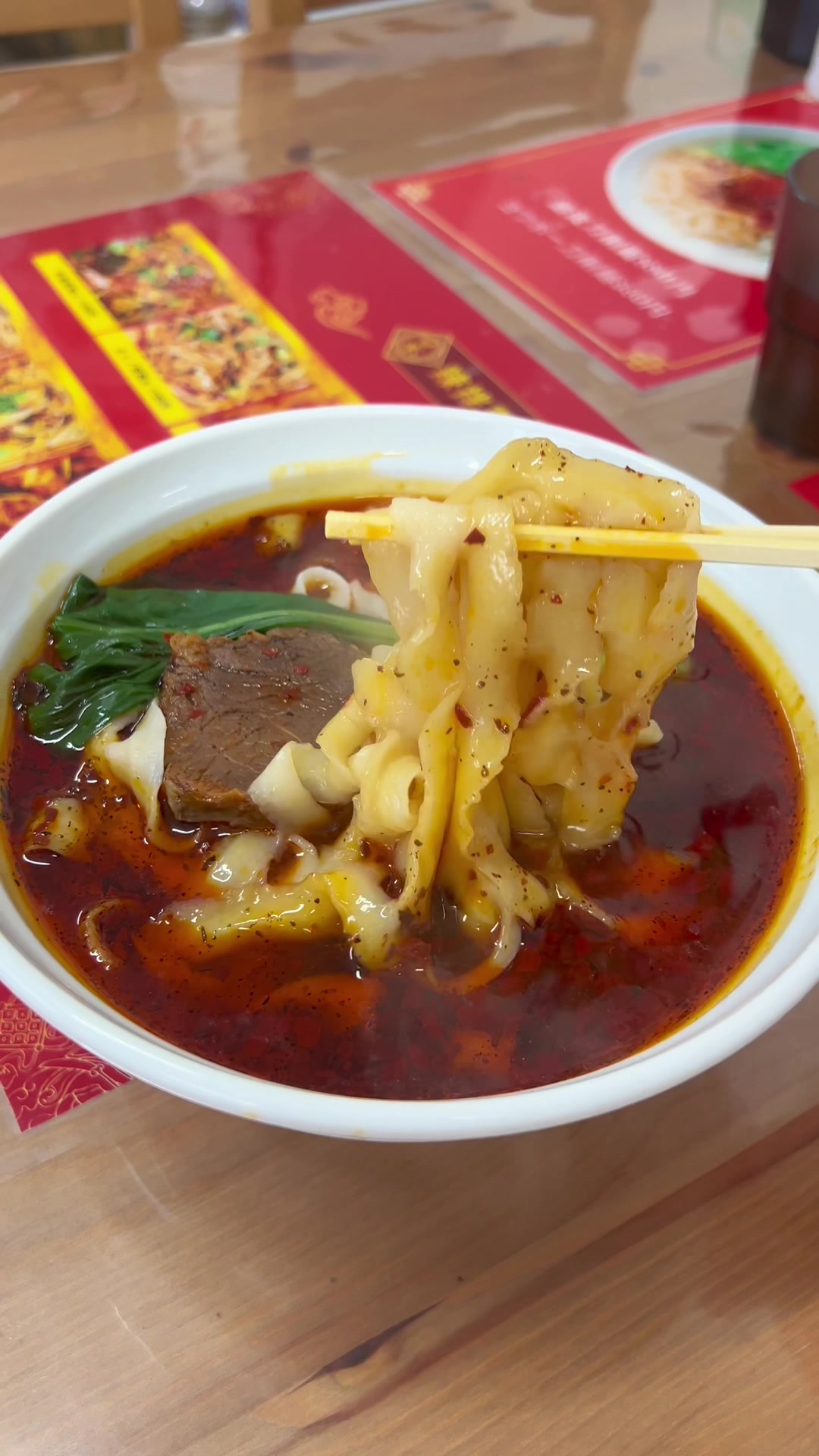 パンチの効いた辛さがクセになる刀削麺🍜店内ではスゴ腕のロボットが麺を削ってた!麺の食感はもちもちで平打ちのうどんみたい!辛いのが好きな人は挑戦してみて!