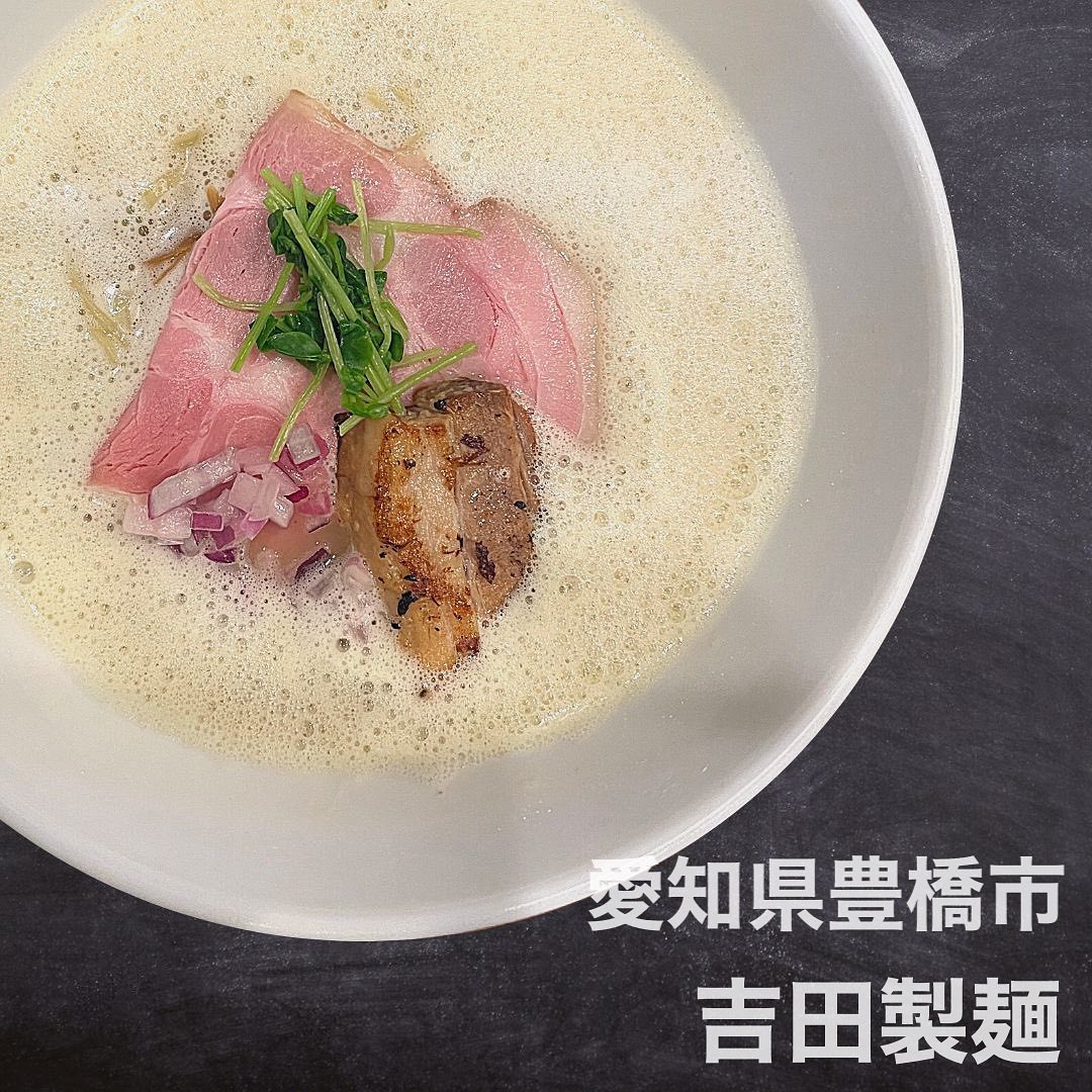 愛知県豊橋市の吉田製麺は、豊橋駅近くのemCampus隣に位置する鶏白湯ラーメン店です。自家製の細い平打ち麺はツルツルで喉越しが良く、泡立つ鶏白湯スープがまろやか。トッピングはレアチャーシューと炙りチャーシューの2種を楽しめます。
