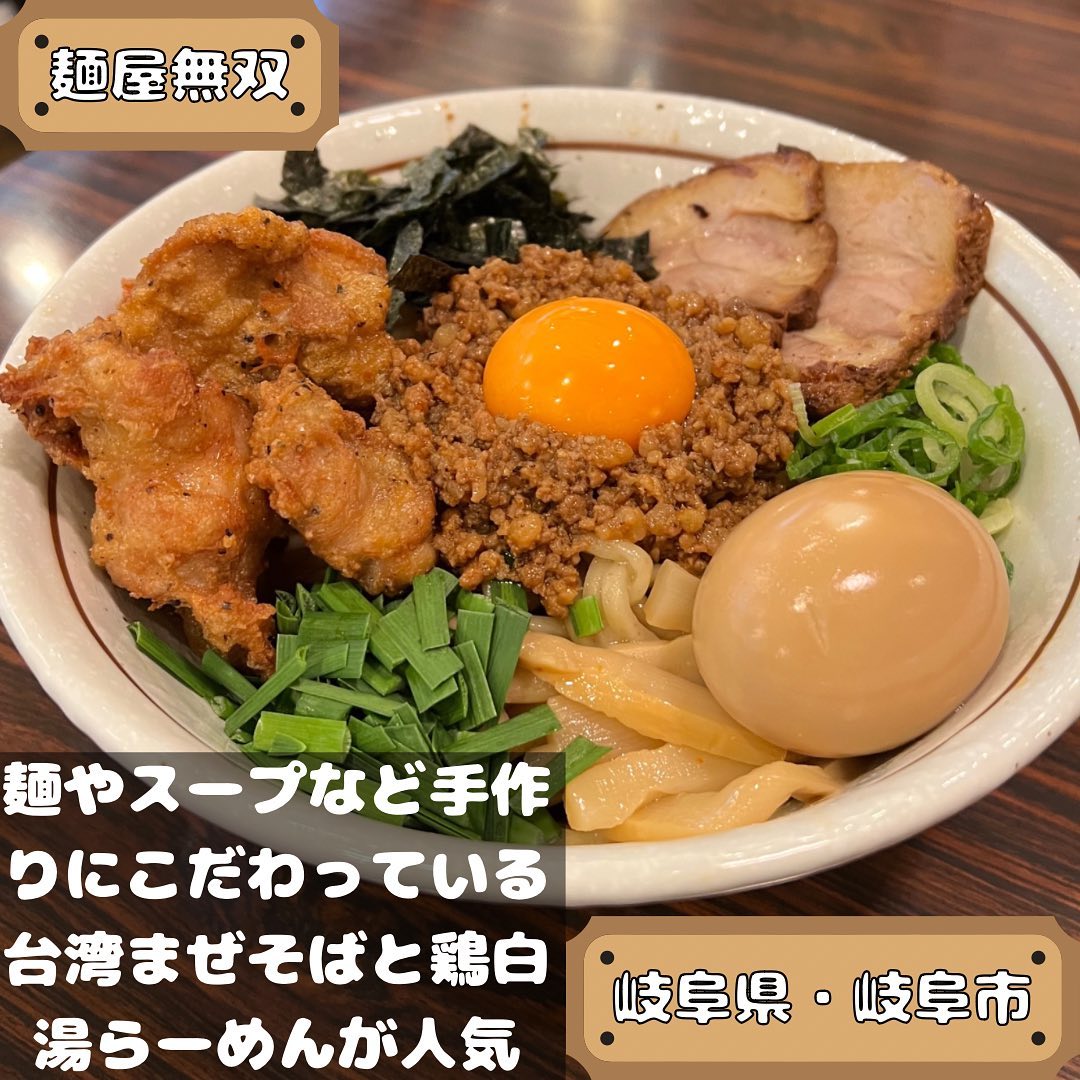 岐阜・折立の人気店、麺屋無双は平打ち麺の台湾まぜそば・坦々まぜそばが名物。無双ごはんは紫蘇と海苔のミニ丼、しそ餃子や唐揚げ丼も人気。ポイント制度で無料になる特典も魅力です。