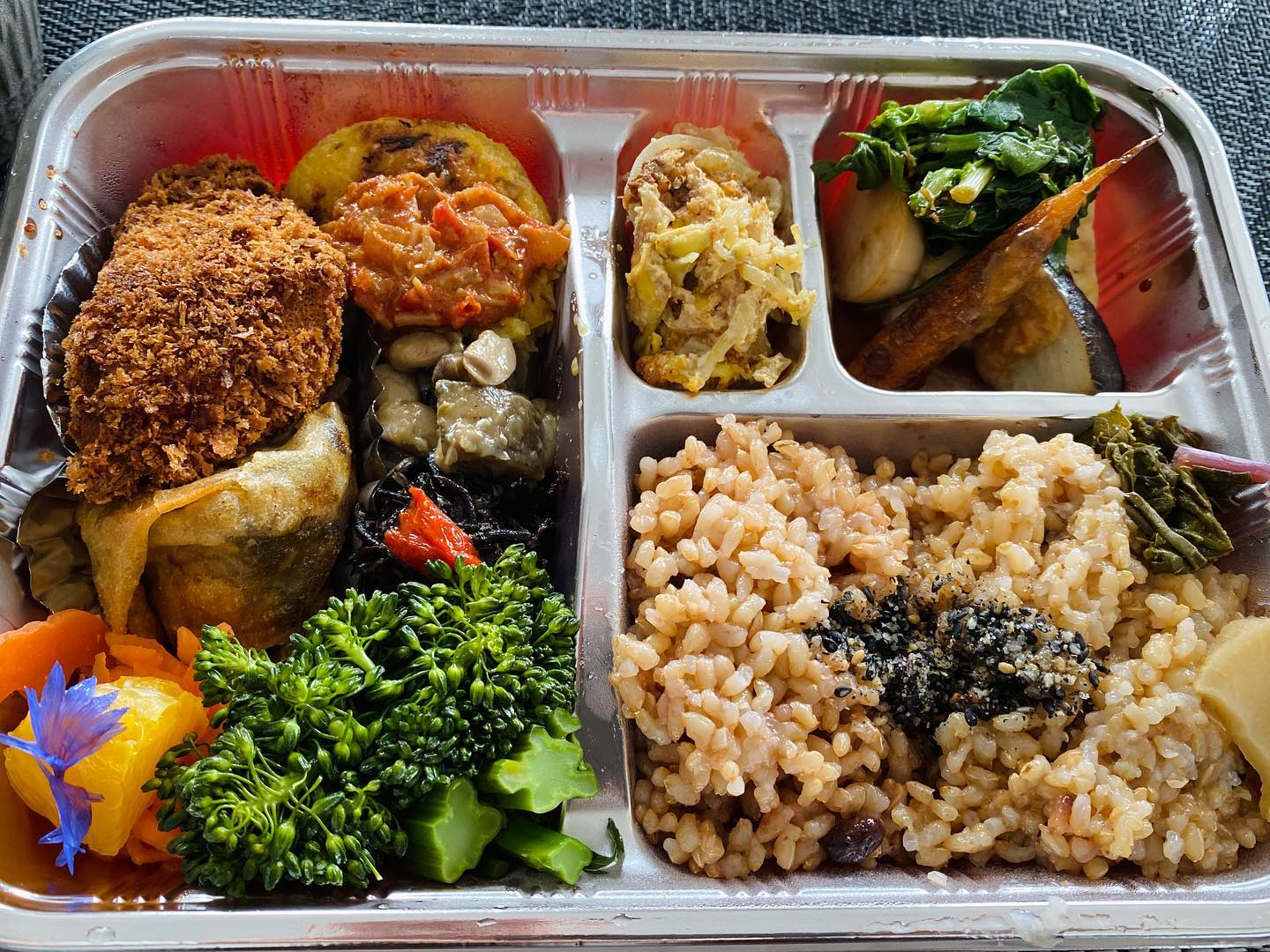 金山の玄米菜食カフェ『のら』は、駅からやや離れた静かな場所にあります。メインは5種から選べ、プレートには8品のおかず・サラダ・スープ・味噌汁・ハーフ&ハーフのご飯が付きます。平日は1100円です。