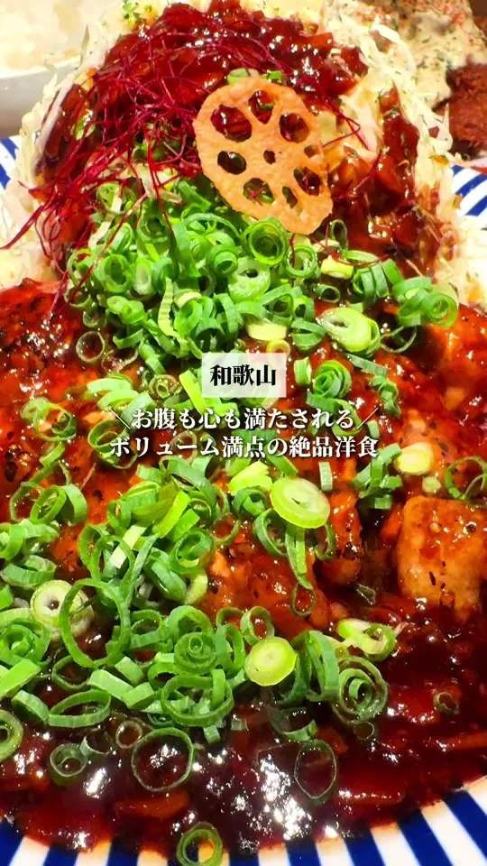 和歌山のグルメを紹介する投稿より、岩出市の山田ヒロキチ商店は超がっつり洋食店です。名物のトンテキは山盛りキャベツと大量のガーリックが圧巻で、ソースは16種類。テイクアウトやお弁当も充実しています。
