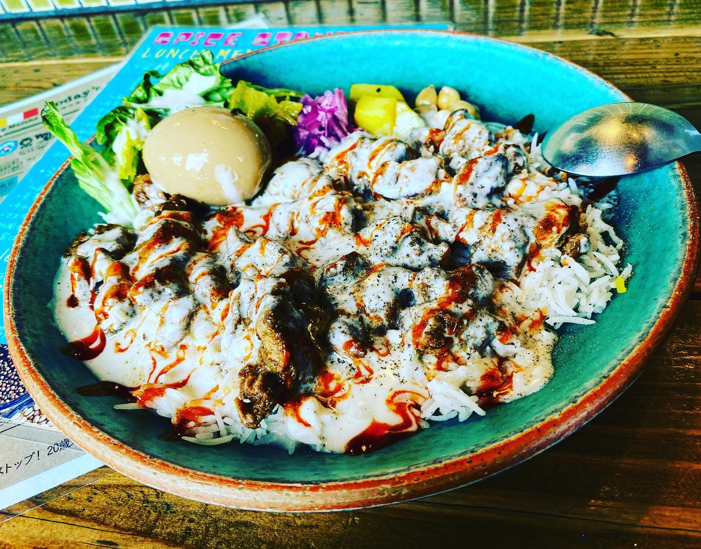 ジャークチキンオーバーライス+スパイスタマゴ.