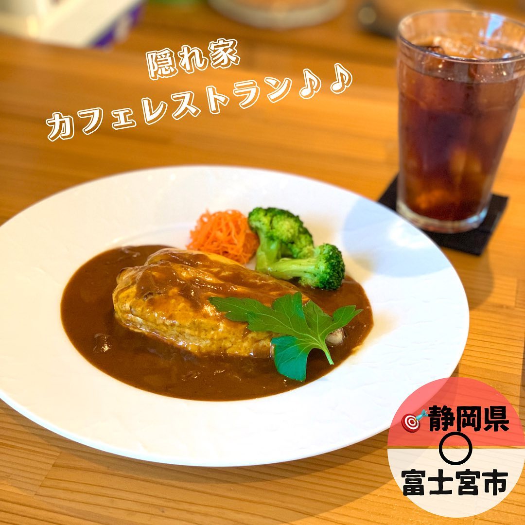 山間の隠れ家風カフェレストラン。窓際から富士山が望め、アットホームな雰囲気が魅力です。贅沢オムライスはカレーソースとホワイトソースを半分ずつ、エビのトッピング。鶏むね肉のチーズ焼きカレー風味もおすすめ。11時〜21時、月曜定休、駐車場あり。